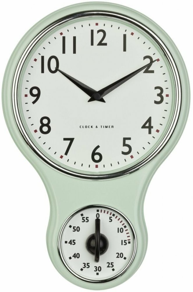 Retro kuchyňské nástěnné hodiny se zabudovanou minutkou. Kombinace nostalgického šarmu s praktickou funkčností, která dodá každému interiéru stylový vintage nádech. Zaoblený tvar a mátově zelená barva upoutají pozornost v každé kuchyni - nebo kdekoli, kam je pověsíte.