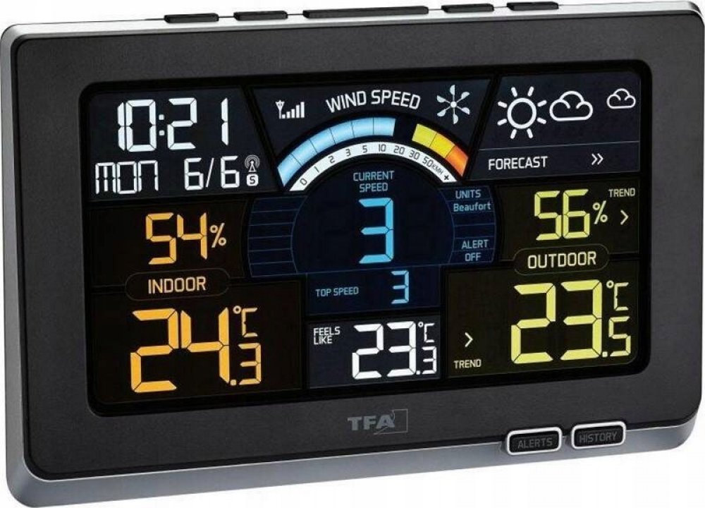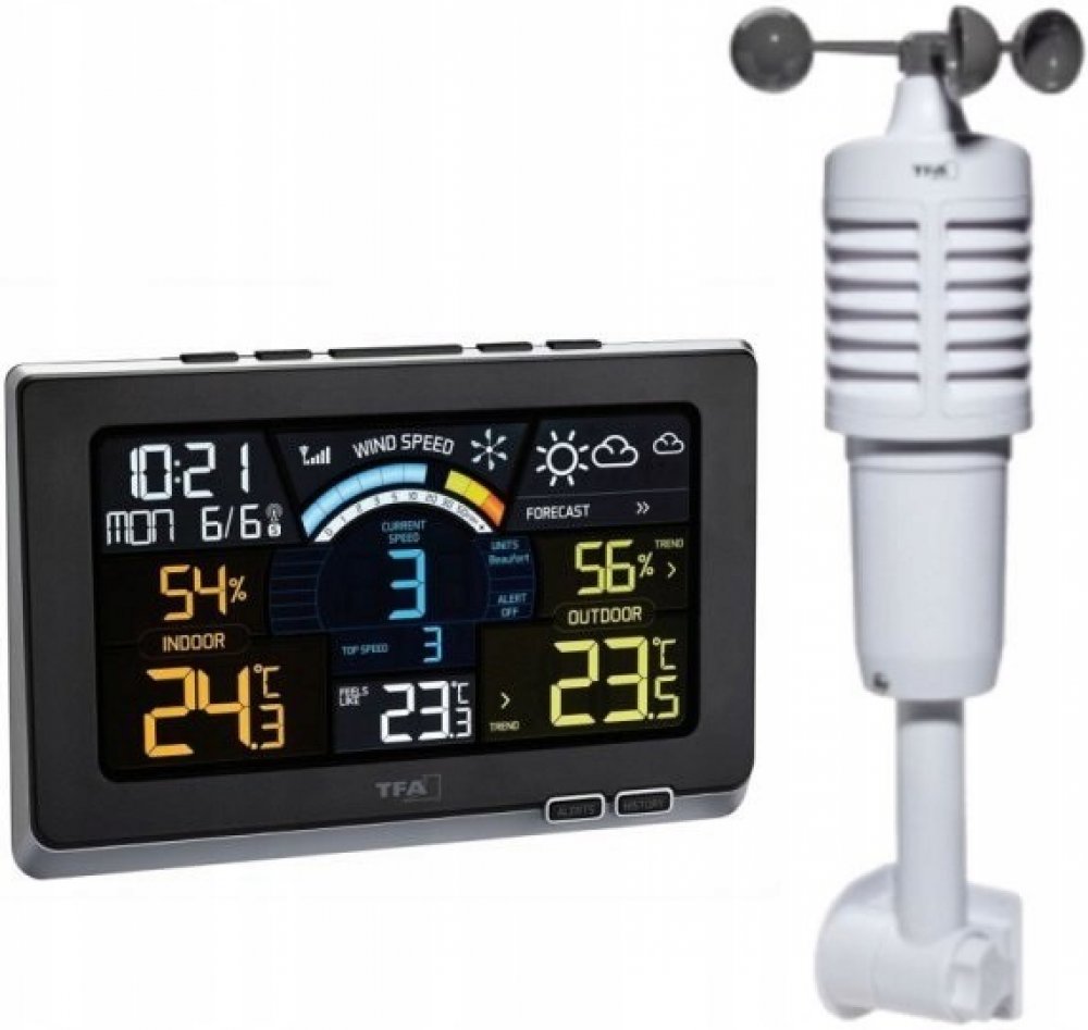 Digitální meteostanice, bezdrátový přenos z čidla (součástí balení) na max. vzdálenost 80 m, zobrazuje vnitřní teplotu/vlhkost a venkovní teplotu/vlhkost, rychlost větru, rosný bod, tendenci vývoje vnější teploty/vlhkosti, pocitovou teplotu