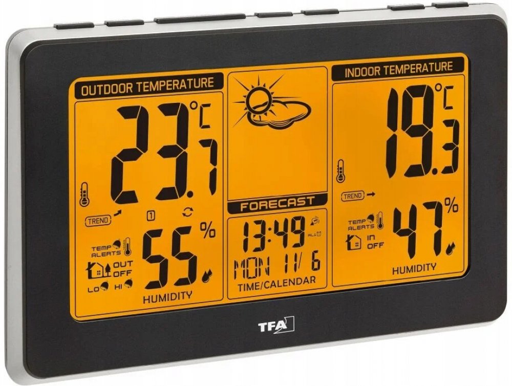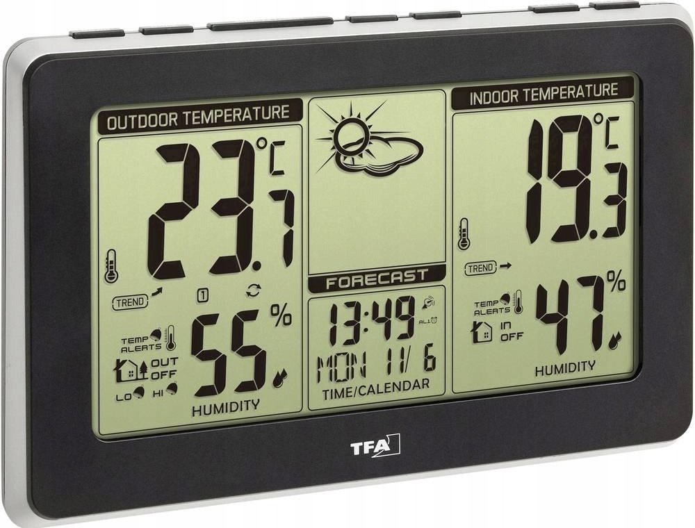 Jeden pohled na meteorologickou stanici MONDO a hned budete v obraze. Systematické rozvržení hodnotna displeji pomáhá snadněji určit jednotlivé informace - v levé části venkovní hodnoty, v pravé ty vnitřní a uprostřed informace o předpovědi počasí a čase/datu. Informace o venkovní teplotě a vlhkosti je přenášena do přijímací konzole bezdrátově, vnitřní klima (teplota, vlhkost) je také zobrazeno na displeji přijímače. Přesný čas a datum zajistí přijímač DCF signálu. Na přístroji lze také nastavit budík s funkcí odloženého buzení (SNOOZE).