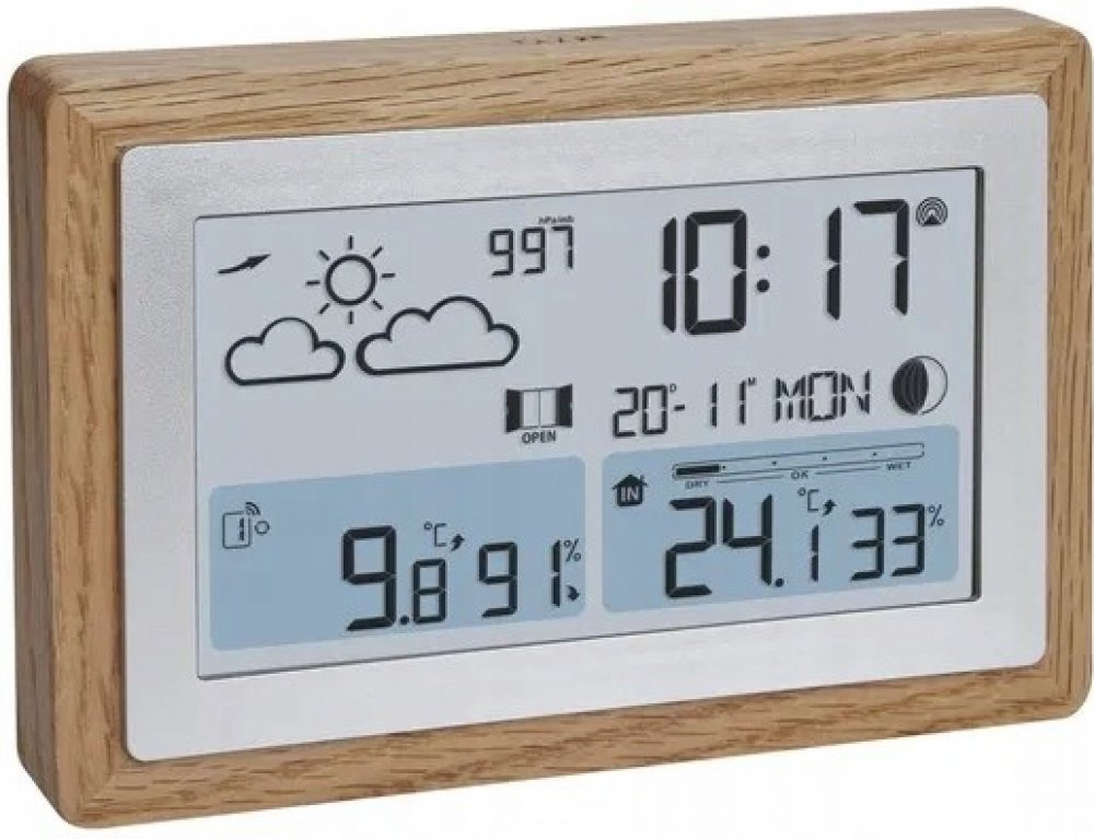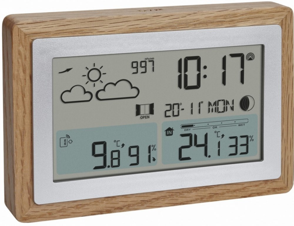 - Funkčnost meteostanice: datum, rádiové hodiny (DCF77), den v týdnu, nastavitelné časové pásmo, venkovní vlhkost, venkovní teplota, vlhkost v místnosti, pokojová teplota, indikátor komfortu, hodnoty MAX/MIN, max. 3 senzory, předpověď počasí, fáze měsíce,...