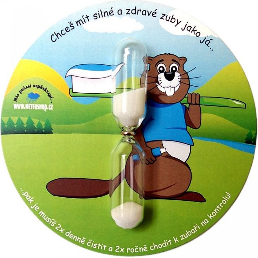 Přesýpací hodiny ve skleněném provedení, umístěné na tvrdém papíru. Ideální do koupelny, motivující k čištění zubů. Písek v hodinách má bílou barvu. Měřený čas je pouze orientační.