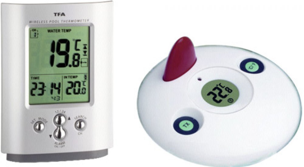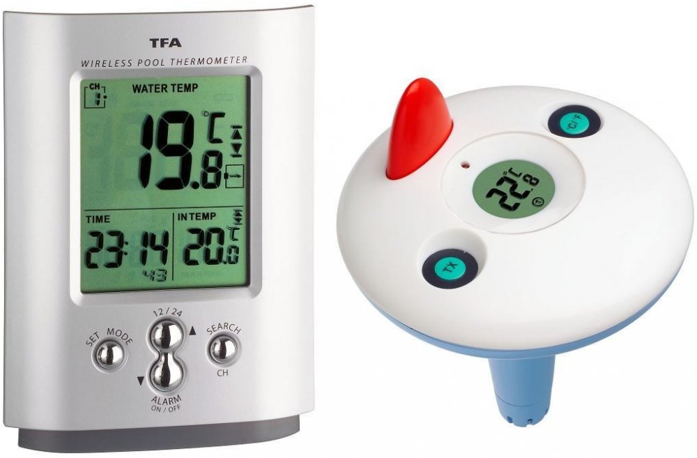 Bazénový bezdrátový digitální teploměr. Příjem a zobrazení teploty až ze 3 bezdrátových čidel pomocí rádiového signálu na frekvenci 433 MHz. Součástí balení je jednoplovoucí teplotní čidlo, které je určeno pro měření teploty vody na hladině. Rozsah přenosu do 30 m ve volném prostoru a bez elektromagnetického rušení. Přístroj umí komunikovat i s bezdrátovými čidly TFA 30.3133 a 30.3139 určené pro m...