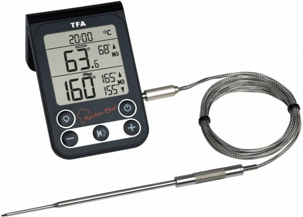 Díky možnosti kontrolovat během pečení teplotu uvnitř masa se vám již nestane, že by připravované maso či drůbež při podávání byly vysušené či naopak nedopečené. Teploměr se sondou oceníte také při přípravě steaků. Doba jejich přípravy k dosažení žádaného stupně propečení závisí na použitém zdroji tepla a jejich tloušťce. Digitální vpichový teploměr TFA 14.1512.01 KÜCHEN-CHEF pomocí vpichového čidla zjistí aktuální teplotu uvnitř masa a zároveň i okolní teplotu v troubě. Při dosažení cílové teploty uvnitř masa se ozve zvukový alarm. Nastavit můžete alarm také pro horní a dolní rozmezí teplot v troubě či grilu. Teploměr potěší časovačem a přehledným podsvíceným displejem, můžete ho postavit na rovnou podložku nebo upevnit pomocí magnetu umístěného na jeho zadní straně. Klíčové vlastnosti digitálního vpichového teploměru TFA 14.1512.01 KÜCHEN-CHEFPro kontrolu teploty v troubě a zároveň uprostřed pečeného a grilovaného masaHlídání teploty v troubě či grilu nastavením horního a...