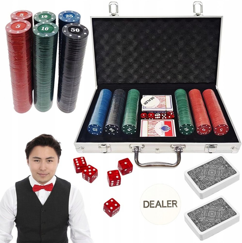Fantastická kompletní sada pro hraní Texas hold'em pokeru a dalších karetních her Sada obsahuje vše, co ke hraní potřebujete. Žetony mají správnou hmotnost a jsou vyrobeny z plastu s kovovým diskem uvnitř, vhodné pro dealerské show, Texas holdem poker hry, ruleta a další.