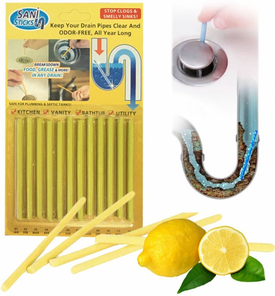 Tyčinky na čištění odpadu 12 ks TFY SANI-STICK-Lem12 zabraňují zápachu, ucpání. Udržují čistotu a průchodnost. Do kuchyně, koupelny atd. Stačí jedna tyčinka na měsíc. Bezpečné pro žumpy a vodovodní rozvody.