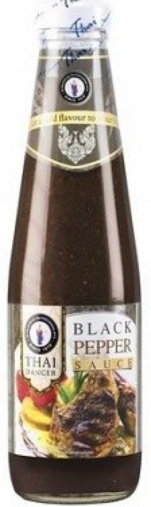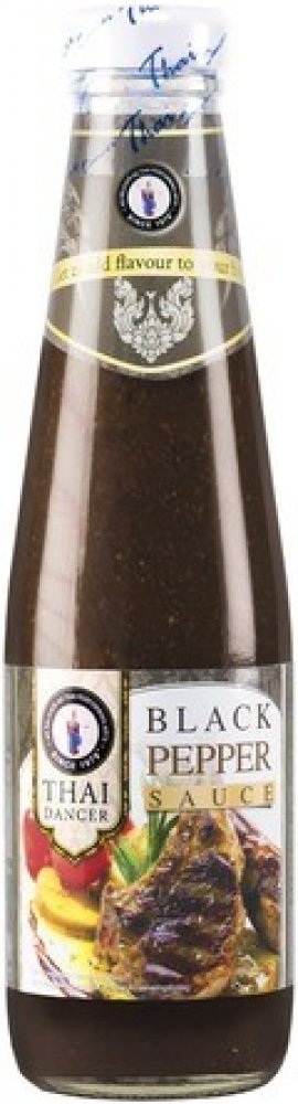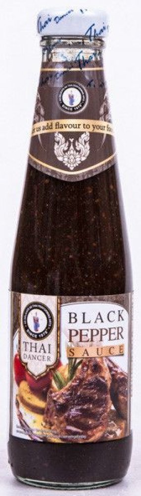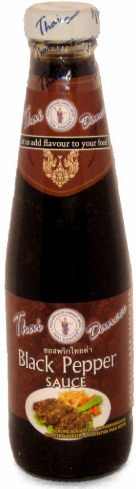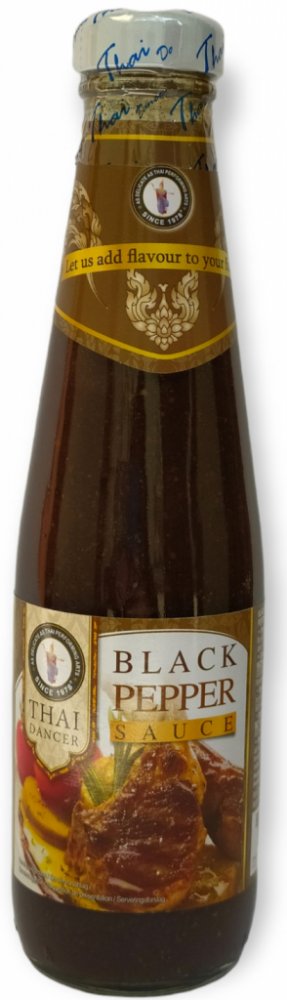 Pepřová omáčka k pečení na pánvi Thai Dancer. Složení: Pepř černý mletý 42procent, voda, cukr, soja, česnek, sůl, modifikovaný kukuřičný škrob, pšeničná mouka, zvýrazńovač chuti E621, barvivo E150c, konzervant E211. Skladujte v suchu a chladu. Po otevření uchovejte v chladničce. Země původu Thajsko