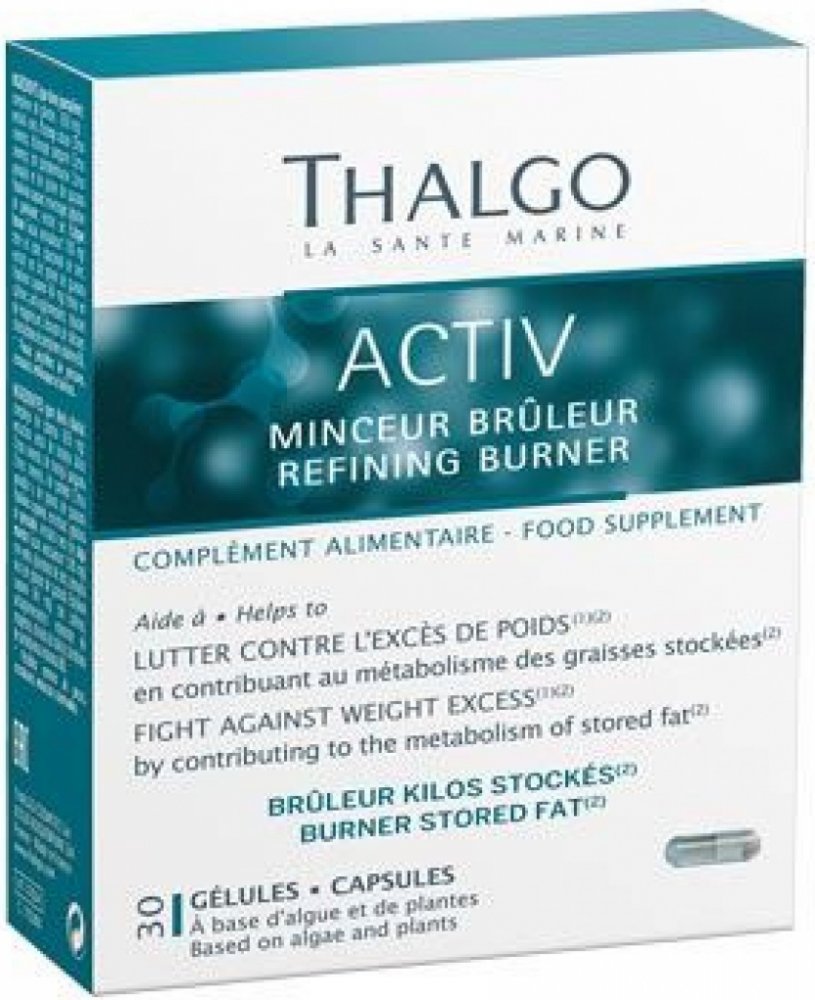 Zeštíhlující tablety Activ Refining z mořských řas a rostlin pomáhají viditelně zeštíhlit postavu. Tato nutrikosmetika působí na tři klíčové mechanismy hubnutí. Jsou účinné i bez změny jídelníčku a cvičení. Klinická studie vykonaná na 19 dobrovolnících po dobu 1 měsíce ukázala úbytek až o 5,5 kg a 4,2 cm v obvodu pasu. Kapsle jsou 100% přírodní mořské.Zmírňuje chuť k jídlu díky řase Fucus Vesiculosus, která v žaludku nabude a navodí pocit sytosti. Eliminuje nadbytečný tuk pomocí aktivní látky Actif Sinetrol®, extraktu z guarany a komplexu citrusových plodů. Tyto látky štěpí tuky, uvolňují je do oběhu a také zvyšují spalování tuků.Použití: konzumují se 2 kapsle denně na začátku jídla. Obsahuje 15 denní kúru.100 % přírodní doplňky stravy účinkují přímo v srdci buněk. Řada Thalasso-Nutrition zvyšuje účinnost kosmetických produktů zevnitř. Thalgo, specialista na mořské řasy, pro vás vytvořilo opravdovou orální thalassoterapii pro udržení rovnováhy vašeho těla. Tyto doplňky stravy jsou plné minerálů, vitamínů a esenciálních mastných kyselin z mořských řas a rostlin.Tento doplněk stravy se užívá jako součást vyvážené stravy a zdravého životního stylu. Skladujte mimo dosah dětí. Nepřekračujte doporučenou denní dávku.Thalgo je přírodní kosmetika z mořských řas a minerálů pro přirozenou a účinnou péči o vaši pleť.Referenční výživové hodnoty.Obsahuje živiny a látky s fyziologickými účinky,*Doporučená denní dávka. 2 kapsle obsahují DDD* Jód 100 µg 67% Kofein 27,1 mg Vitamín B6 1,4 mg 100% Zinek 10 mg 100% Upozornění!Tento doplněk stravy se užívá jako součást vyvážené stravy a zdravého životního stylu. Skladujte mimo