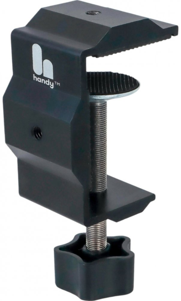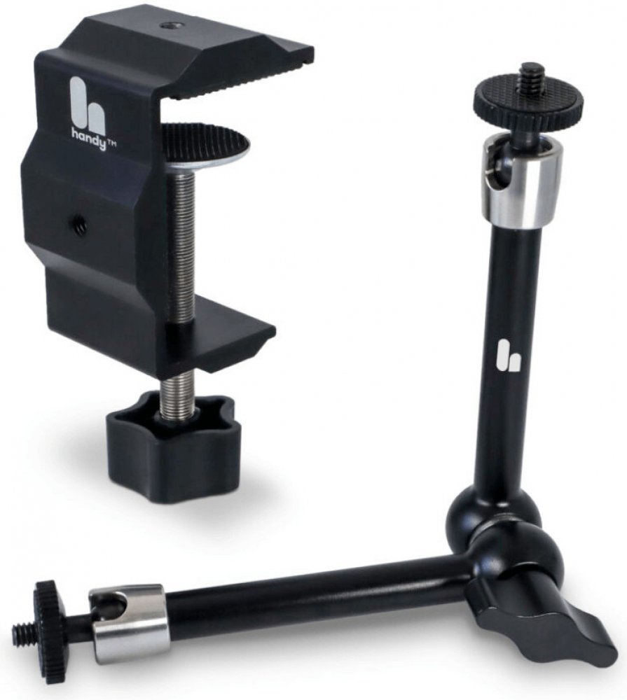 Držák na stůl Handsfree je vyroben z kvalitního hliníku, nerezové oceli a gumy, což zajišťuje jeho dlouhou životnost a odolnost. Jeho kompaktní rozměry 11 x 6 x 4,5 cm a možnost otevření až na 6 cm umožňují snadnou instalaci na většinu stolů či pevných povrchů. Každé rameno má délku 13 cm a šířku 2,5 cm. Držák obsahuje 1/4" závity, které zaručují pevné připevnění. Poznámka: Pro připojení The Handy...