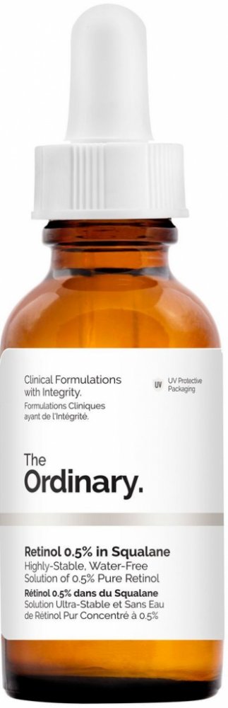 Vysoce stabilní sérum The Ordinary Retinol 0,5% In Squalane s 0,5% koncentrací čistého retinolu, složkou, která účinně bojuje proti příznakům stárnutí. Retinol je silnou formou vitaminu A, podporuje výměnu buněk a odhaluje zdravější a jemnější pokožku. Zároveň řeší tmavé skvrny, nerovnoměrný tón pleti, jemné linky a vrásky. Díky séru získáte zpět svěží a mladistvou pleť.