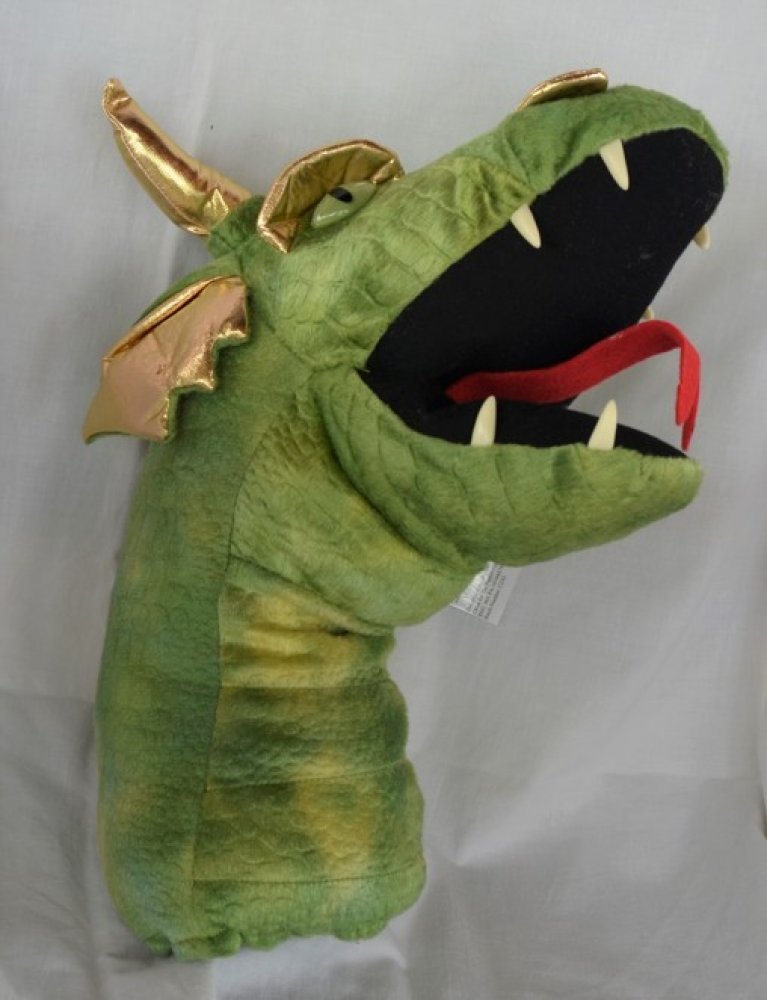 Maňásek z kolekce "Large Dragon Heads" - hlavy velkých dinosaurů - Zelený drak - je veliká hlava draka, která může i vyděsit. Ruka se vkládá krkem do tlamy tak, že ji může otevírat a zavírat. Maňásek je velmi měkký a příjemný na dotyk.