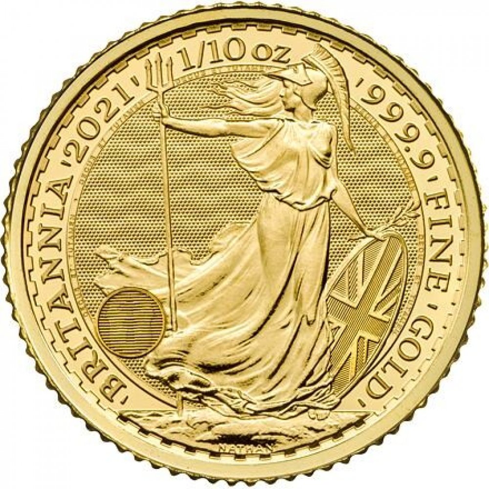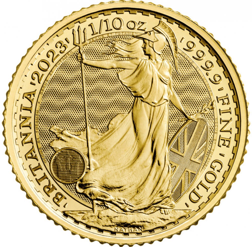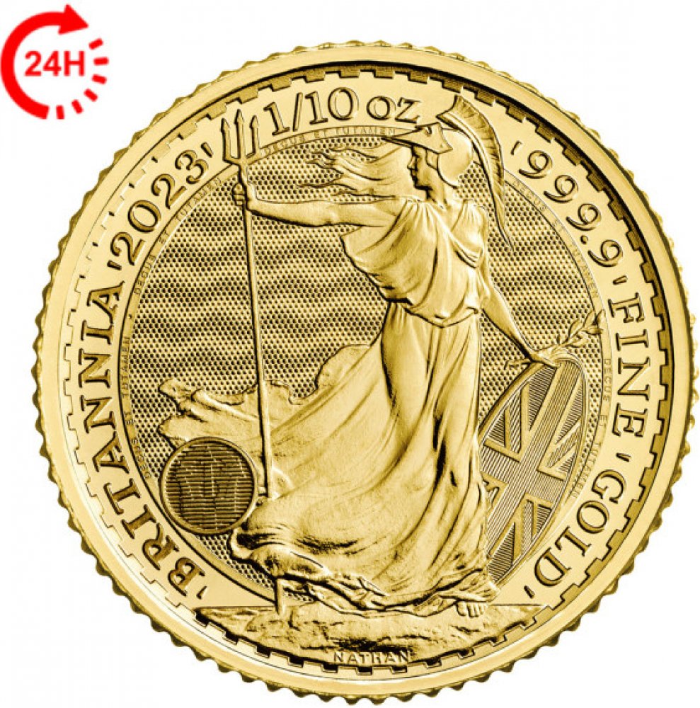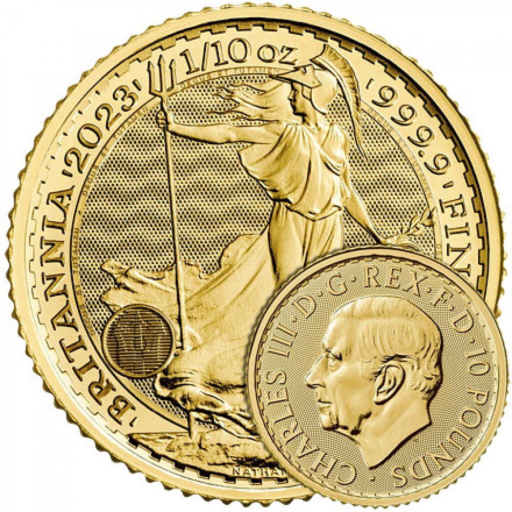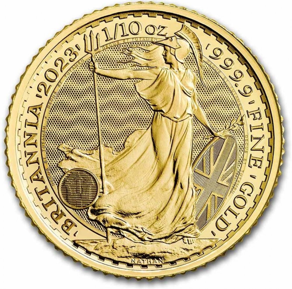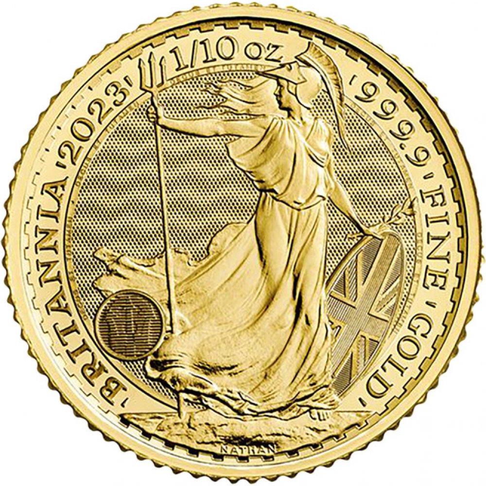 Zlatá investiční mince Britannia je ražená Britskou královskou mincovnou (The Royal Mint) v 4 velikostech 1 Oz, 1/2 Oz, 1/4 Oz a 1/10 Oz a tradičním motivem je ženská personifikace Británie. Mince jsou raženy z čistého 999,9% zlata (24kt). Rubová strana zachycuje bohyni bojovnici v rozevlátém rouchu a korintské přilbě na vrcholku útesu, aby tak ztělesňovala neochvějnou hrdost národa. Na okruží mince je uveden nápis BRITANNIA, rok emise a údaje o ryzosti a váze kovu. Na lícové straně mince o velikosti 1 oz (jedné trojské unce) Britannia je zobrazen profil královny Alžběty II. V roce 2023 byla mince vyražena ve dvou verzích, s portrétem královny Alžběty II a portrétem Karla III. ve verzi určené speciálně pro řadu pamětních mincí u příležitosti jeho korunovace. Portrét krále, vytvořený britským sochařem Martinem Jennigsem, je doplněn o tudorovskou korunu. Na minci je vyražen nápis CHARLES III • D • G • REX • F • D" a nominální hodnota.
