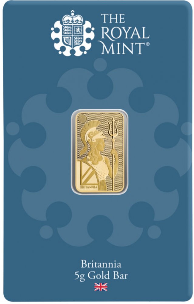 Britský zlatý investiční slitek Britannia se razí v Britské královské mincovně The Royal Mint. Slitek má váhu 5g a ryzost 999.9/1000 Au. Britská královská mincovna přenesla krásu motivu Britannie ze svých zlatých mincí a rozšířila ji na zlaté cihly. Již více než 2000 let je Britannia ikonickou součástí Británie, ztělesňuje národní hrdost a mění ideály a hodnoty v průběhu historie. Uvedením tohoto 1 oz zlatého slitku s motivem Britannie se investorům nabízí nový způsob, jak diverzifikovat svá portfolia a přidat krásu do své sbírky. Jeho design se vyznačuje klasickou krásou Britannie s jednoduchým pozadím s námořní tématikou.Více o mincovně The Royal Mint