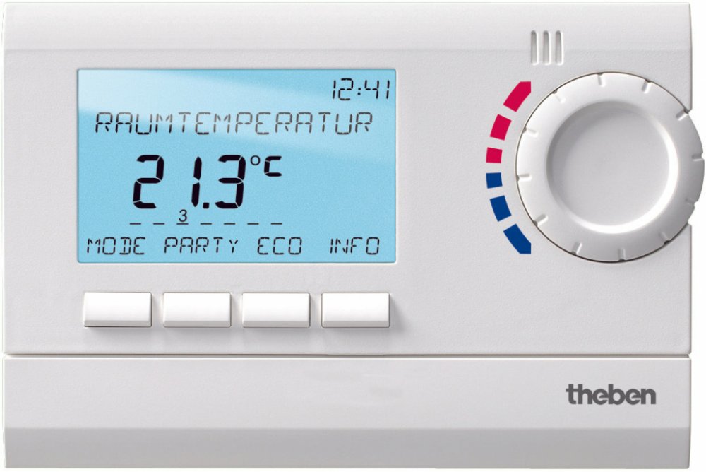 Digitální pokojový termostat, otočný knoflík pro volbu teploty, podsvícený displej, 3 individuálně přepínatelné základní programy, 42 programovatelných spínacích časů (max. 24 na program) s maximálně 5 teplotními úrovněmi, funkce optimalizace, ochrana proti zamrznutí, program Party/ECO, program Dovolená, externí vstup pro detektor přítomnosti, dálkové čidlo, podlahové čidlo, okenní kontakt nebo dálkový telefonní spínač, provozní zámek, funkce ochrany čerpadla, 3 nebo 4vodičové připojení, zásuvný podstavec pro montáž na stěnu nebo do krabice pod omítku, nastavitelný provozní bod a spínací diference, napájení 230 V.