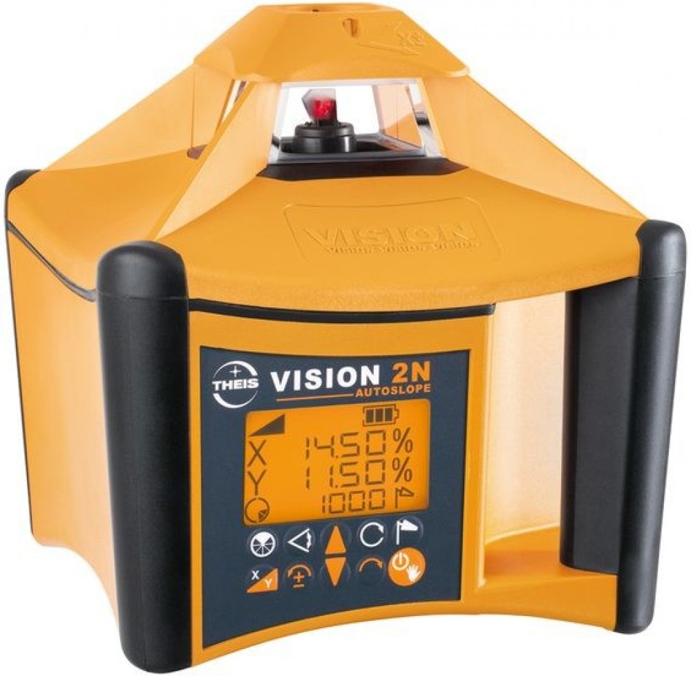 VISION 2N je špičkový stavební laser s vynikajícími parametry měření, mnoha užitečnými funkcemi i vysokou odolnosti (IP 67). Kromě vodorovné roviny je možné sklonový laser Vision 2N využít i pro měření roviny skloněné ve dvou na sebe kolmých osách (X, Y) - a to v rozmezí ±10 %. Další možností je použít tento rotační laser pro měření svislé roviny. Kromě toho, že svislou rovinu můžete natáčet, umí tento přístroj dokonce i takovou rovinu naklonit od svislice, opět v rozmezí ±10 %. Hodnoty sklonu v osách X a Y i hodnota náklonu od svislice se vkládají přímo v %. Navíc je tímto přístrojem možné nastavovat i obecný sklon libovolné velikosti. Velký přehledný displej s logicky uspořádanou klávesnicí umožňuje snadné a intuitivní ovládání všech funkcí, včetně nastavování jednotlivých sklonů.