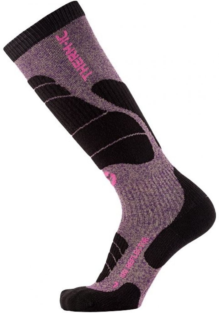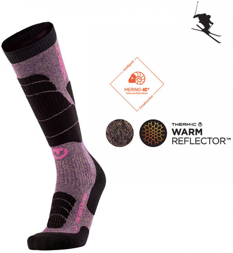 PThermic Ski Merino Reflector jsou unikátní ponožky, vyrobené z měkké a teplé směsi Merino s Thermic Warm Reflector materiálem, který vede a odráží vytvářené teplo. Jeho struktura zajišťuje dobrou cirkulaci vzduchu a odvádí vhkost. Tato kombinace různých druhů vláken udržuje nohu v teple při zachování nejlepší možné cirkulace vzduchu a pro ještě lepší lyžařský zážitek. Ponožky jsou v místě paty a špičky vyztužené a mají integrovaný elastický pásek, který poskyytuje kotníku dobrou oporu. Anatomicky tavrované ponožky dokonale odvádí vlhkost právě za pomoci mikropropustného pásu v místě klenby. Ponožky nebudou z nohy sjíždět a dopřejí maximální komfort.