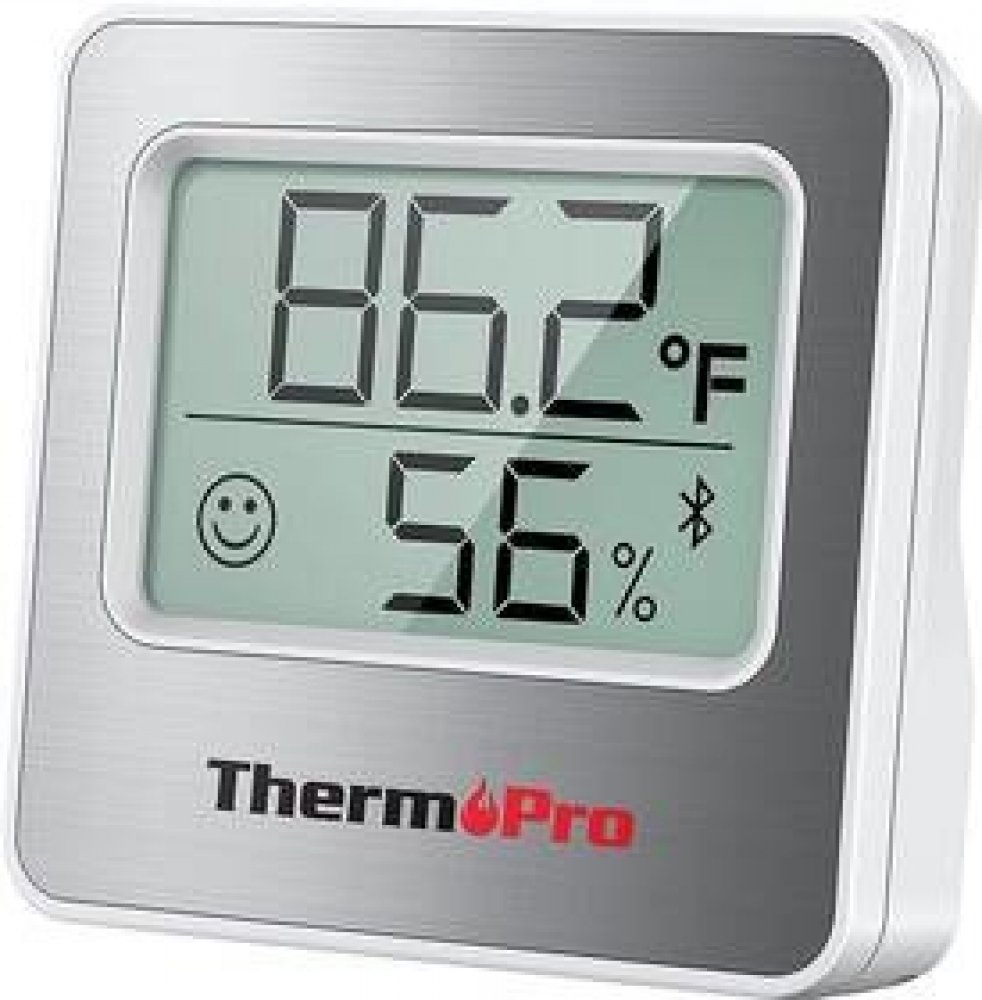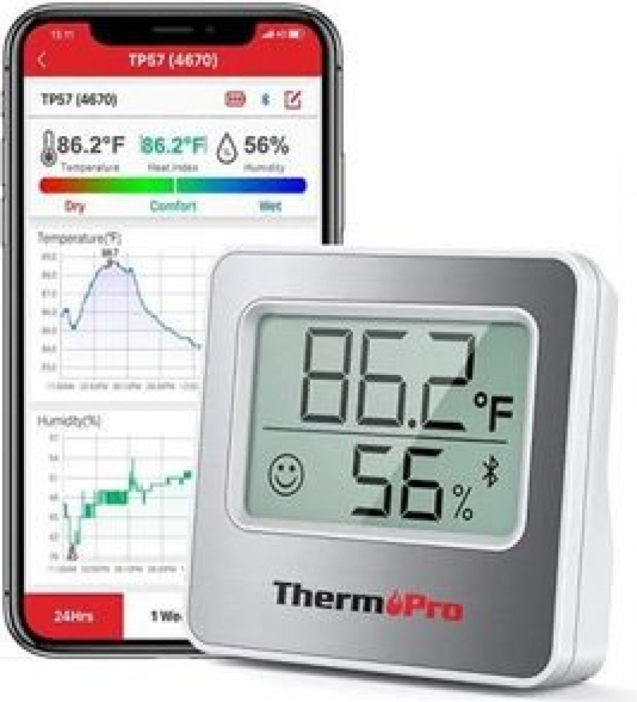 ThermoPro TP-357 je výkonný mini teploměr a vlhkoměr s bluetooth připojením. Teploměr měří teplotu v rozsahu -20 až 60 ˚C s přesností ±0,5 ˚C a vlhkost v rozsahu 10-99 % s přesností ±2 % RH. Měřič vlhkosti je vybaven ikonami pro indikaci stavu a má obnovovací frekvenci 10s. Dosah bezdrátového připojení je až 80m a zařízení je kompatibilní s mobilní aplikací ThermoPro Sensor.