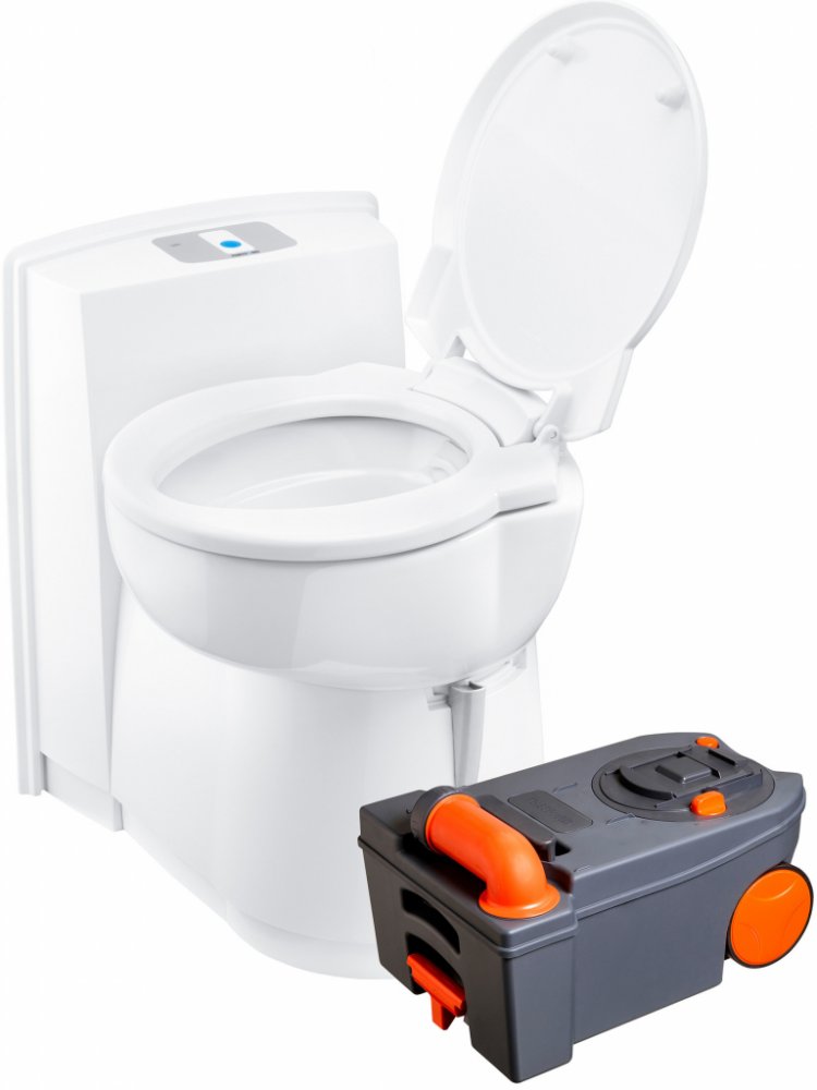 Karavanová vestavná toaleta k dispozici s plastovou nebo keramickou mísou od výrobce Thetford Fekální nádoba je vybavena kolečky a výsuvným madlem Odnímatelný funkční mechanismus pro snadné čištění Vyrobeno z lehkého ale odolného plastu Objem fekální nádoby je 17,5l Čerstvá splachovací voda je brána z vodního okruhu karavanu Ukazatel hladiny fekální nádrže Hmotnost plastové toalety je cca 8kg Hmotnost keramické toalety je cca 16,8kg Výška sezení 479mm Vybaveno otočným mechanisem mísy Servisní dvířka nejsou součástí balení Elektrické splachování Rozměr (V x Š x H) 540 x 417 x 603mm Pro provoz karavanových toalet doporučujeme používat toaletní chemii a rozpustný toaletní papír