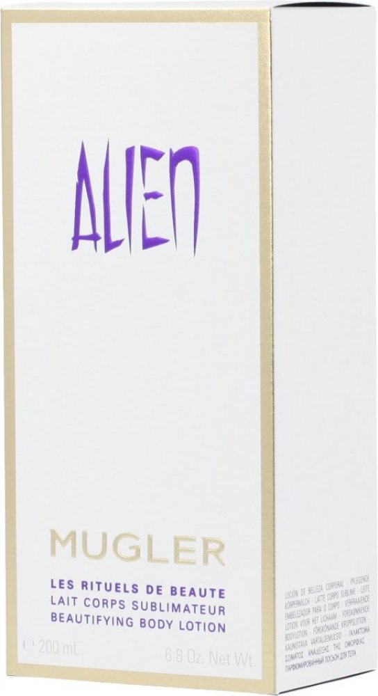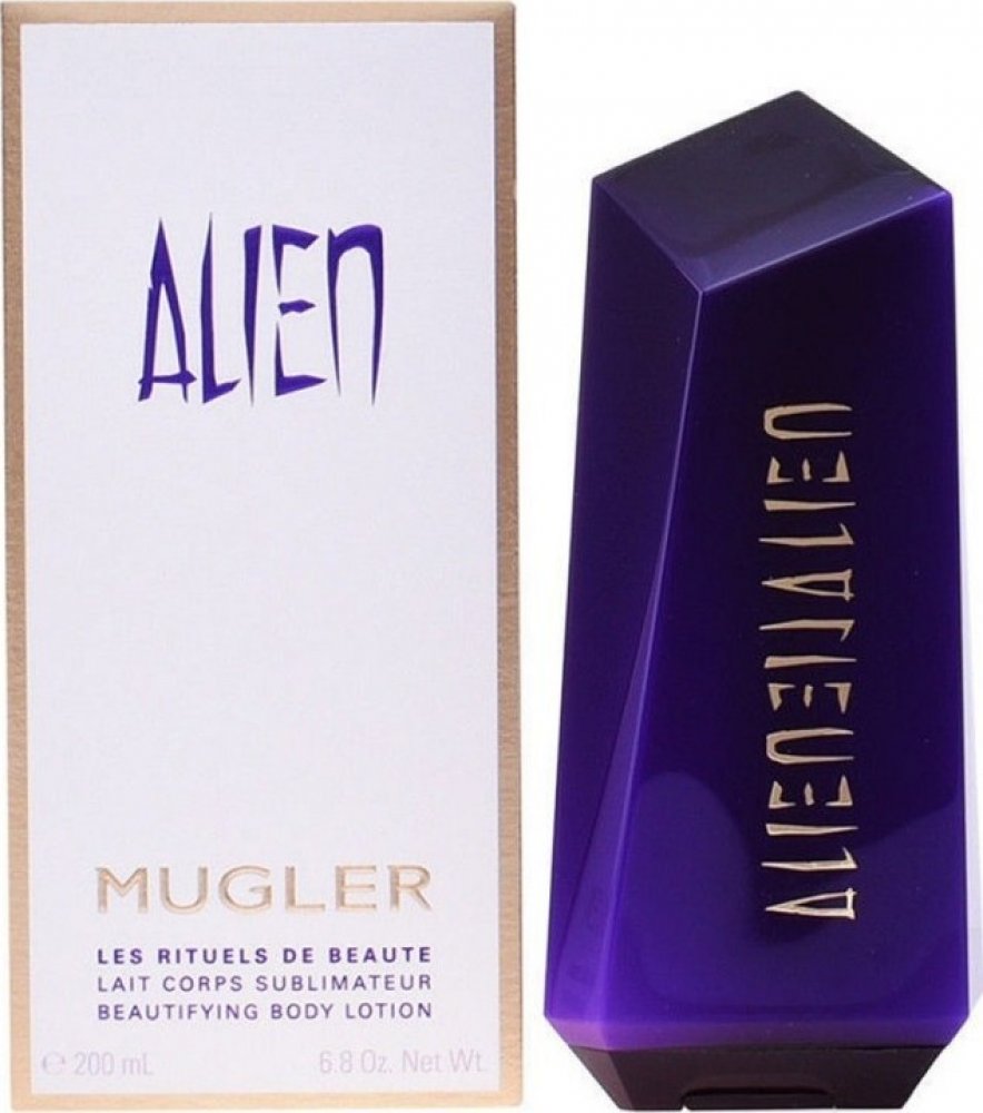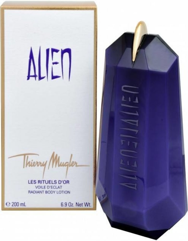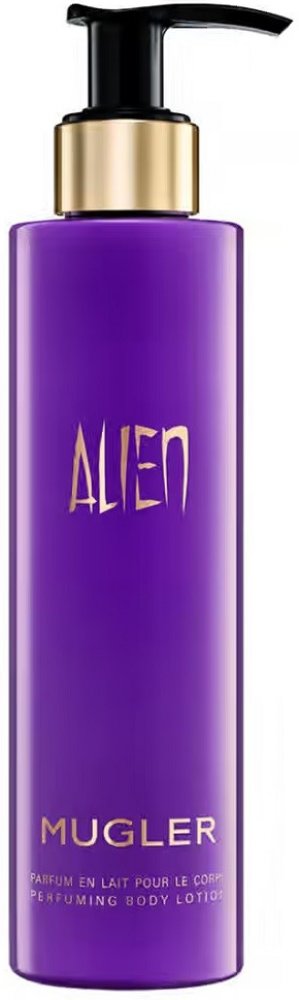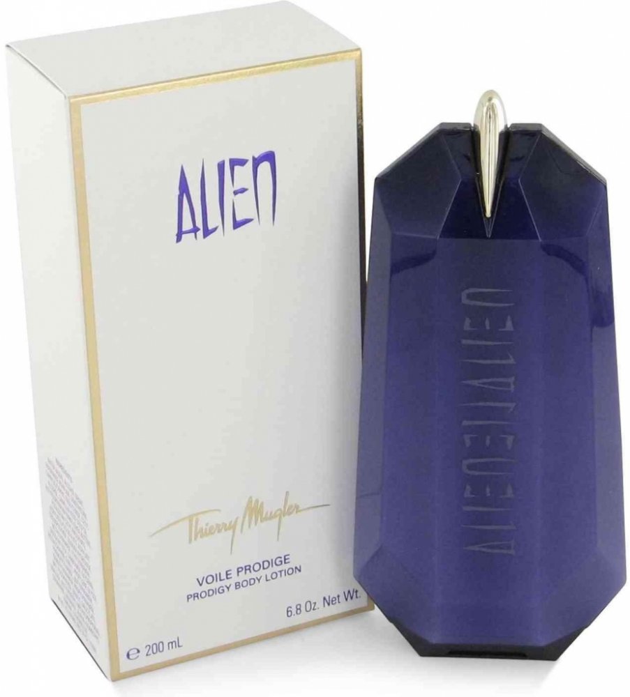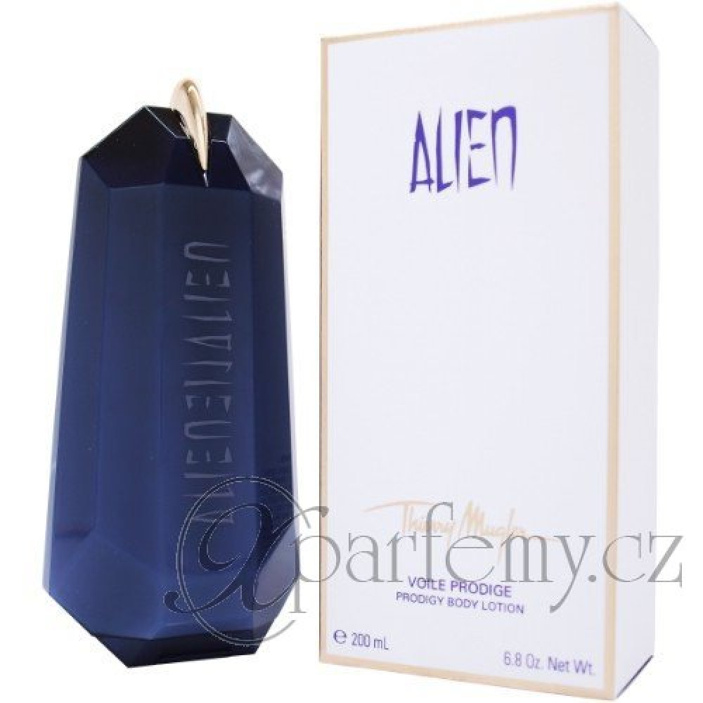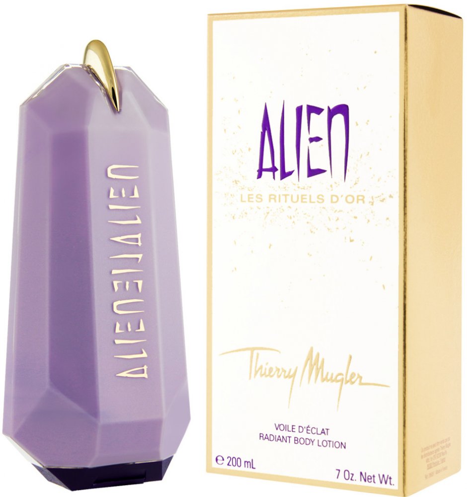 Alien - tělové mléko 200 ml. Alien-cizinec, bytost přicházející odjinud, žena pocházející z jiného světa, mimo naši všednost. Je odlišná, ale přitom nám blízká. Vyzařuje pozitivní energii, mír a magii. Orientálně-dřevitá vůně, která je nabitá pozitivní energií.Vůně byla uvedena na trh v roce 2005.