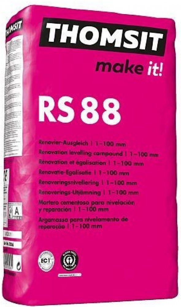Univerzální, rychlá stěrkovací hmota Thomsit RS 88 pro vyrovnání podkladů v interiérech, v tloušťce vrstvy 1–100 mm v jednom pracovním kroku. Thomsit RS 88 je vhodná k: