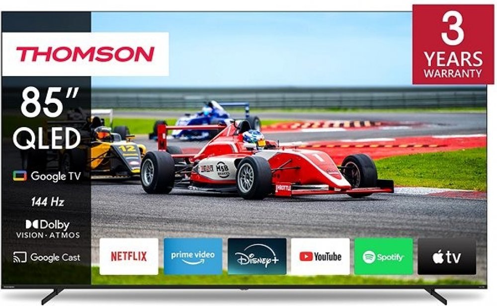 Televize – Google TV, QLED, 215cm, 4K Ultra HD, 100/120 Hz (144 Hz – herní režim), Dolby Vision, antireflexní obraz, DVB-T2/S2/C, 4× HDMI, 3× USB, CI+, USB nahrávání, WiFi, Bluetooth, DLNA, Chromecast, Miracast, herní režim, hlasové ovládaní, Google Assis