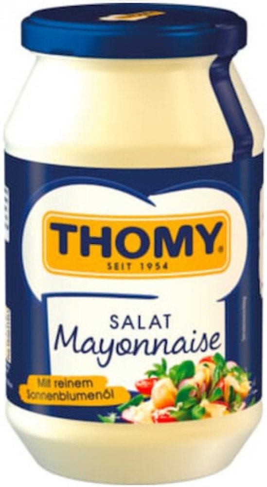 THOMY ... tady přichází potěšení. Naše salátová majonéza THOMY obsahuje to nejlepší z čistého slunečnicového oleje, vybraných hořčičných semen a jemných žloutků. Lahodná krémová konzistence a kořeněná chuť j...