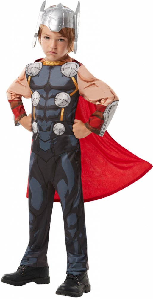 ento kostým Thor™ pro děti je oficiálně licencován společností Marvel™. Součástí je kombinéza s potiskem na trupu a pláštěnka. Černý overal má dlouhé rukávy. Na trupu je potištěno brněním tohoto legendárního boha. Na trupu je potištěn detaily náprsenky bez rukávů, která odhaluje holé paže a manžety. K dokončení tohoto kostýmu je k kombinéze připevněn červený látkový plášť.