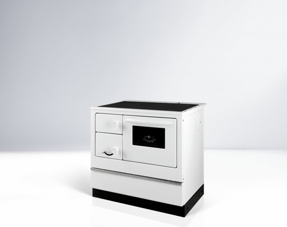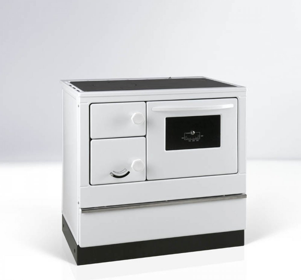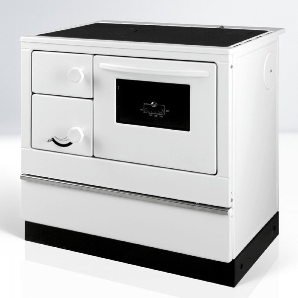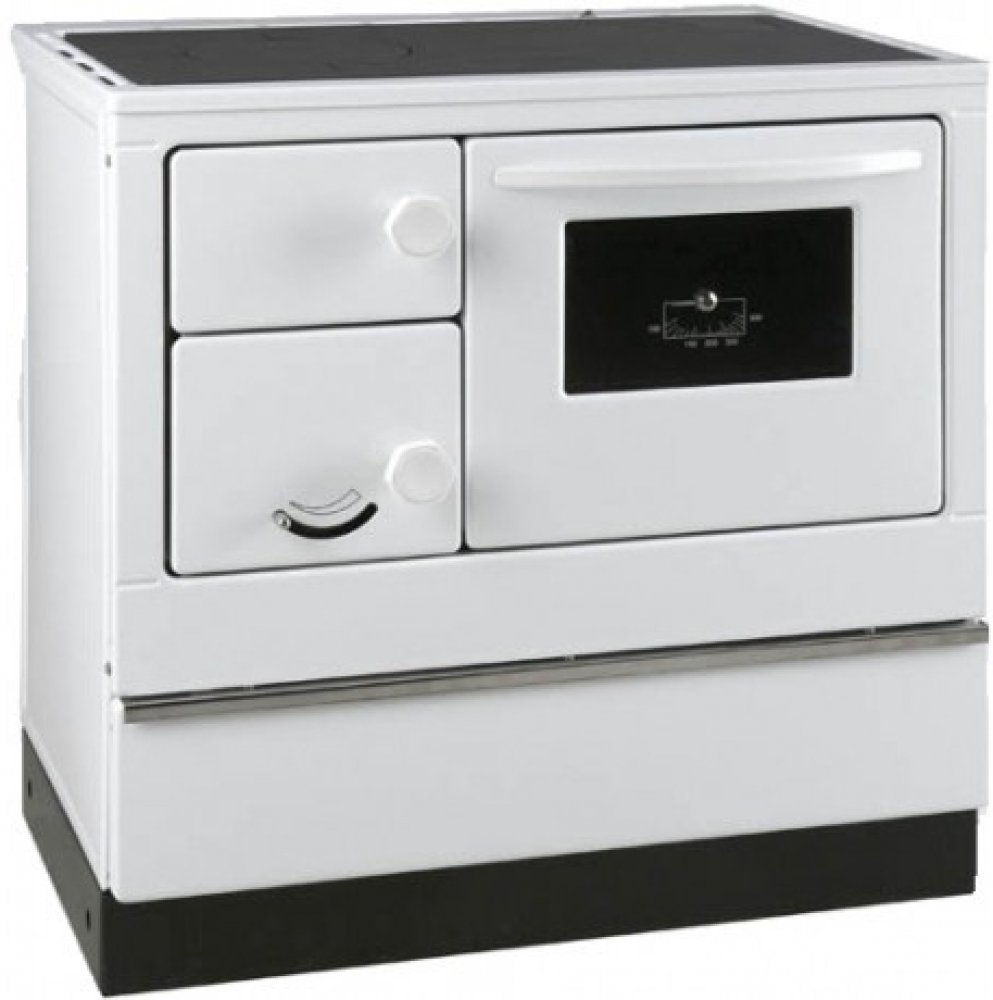Sporák na tuhá paliva Thorma OKONOM 85 FIKO De Luxe bílý pravý, sporák na dřevo v bílém smaltu, výkon 3,5 až 10,5kW (průměrný 7 kW), účinnost 75%, kouřovod DN120 - doboku, dozadu, nahoru, trouba na pečení.