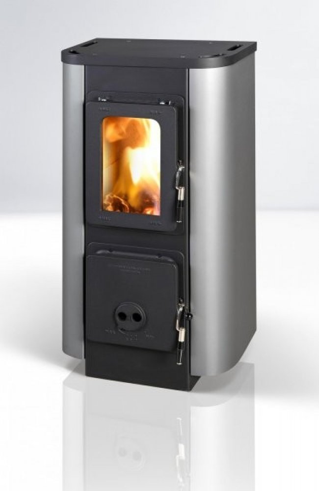 Dvouplášťová krbová kamna pro odkouření DN120, druhý plášť je v barvě inox - nerez. Kamna mají přívod vzduchu na oplach skla a sekundární spalování.