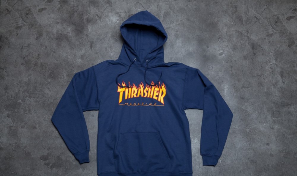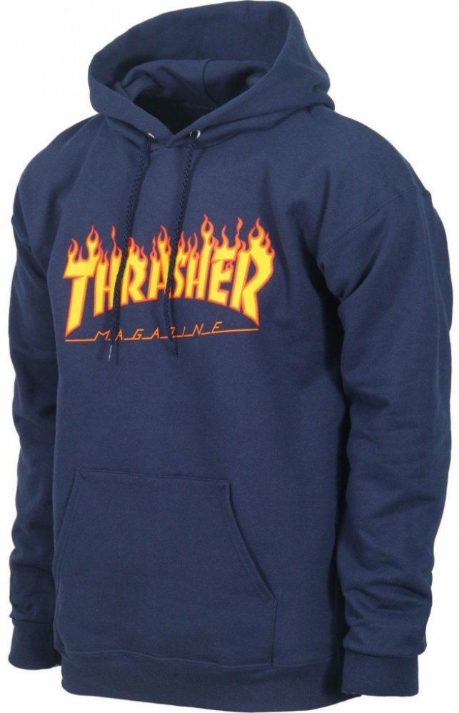 Pánská mikina Thrasher Flame Logo Hoody Navy Blue, v modrém provedení s nápisem na hrudi. Materiál: 80 % bavlna, 20 % polyester Specifikace: Kapuce se stahovací tkaničkou Žebrované manžety a lem Potisk loga na hrudi Kapsa "klokanka