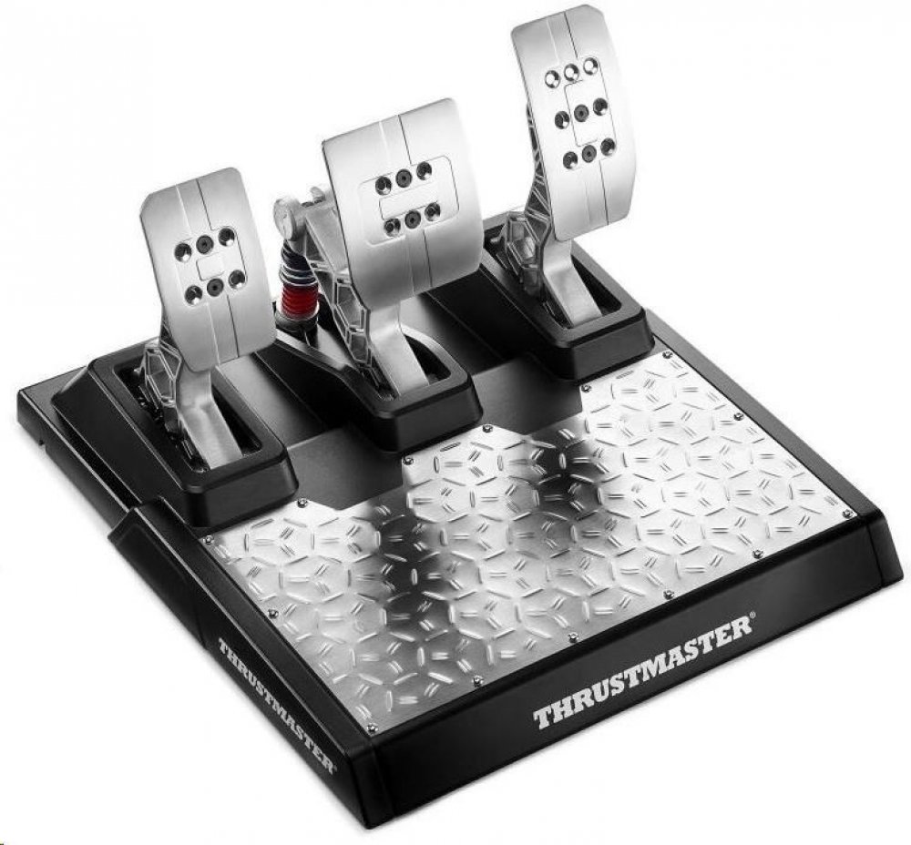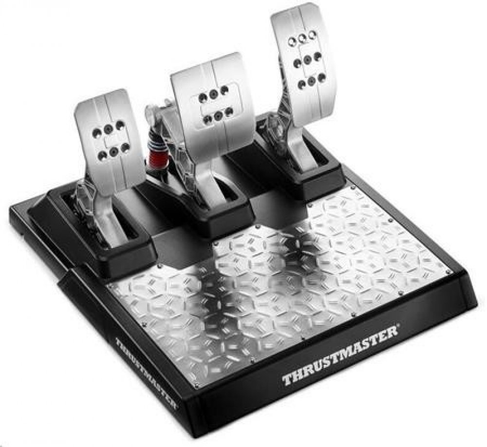 Univerzální a stabilní pedálová souprava T-LCM Pedals poskytuje uživatelům při závodech významné výhody: pedály jsou nastavitelné; souprava 6 pružin umožňuje mnoho možností nastavení; jednotka je vybavena protiskluzovým povrchem, ze 100% vyrobena z kovových materiálů; a nastavení pedálové soupravy (mrtvé zóny a elektronická síla [Brake Force]) lze seřídit prostřednictvím přiloženého softwaru.