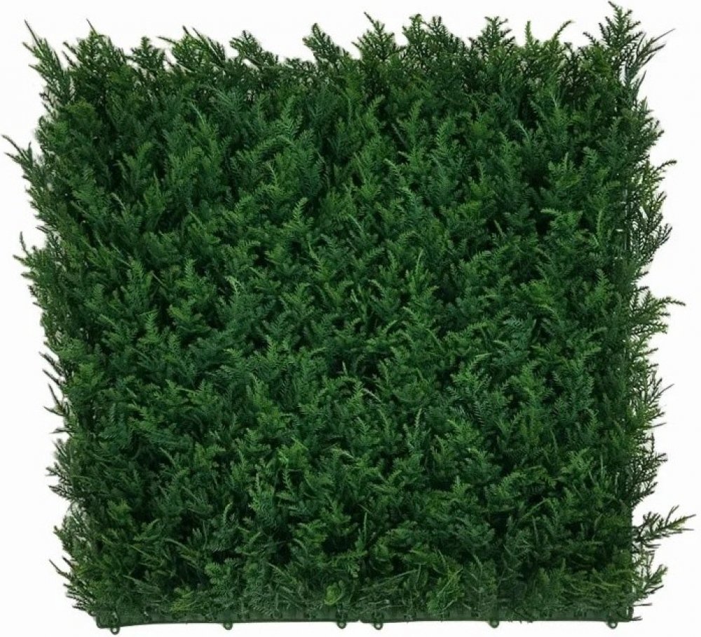 Nosnou kostru tvoří zelené plastové dílce z PE o velikosti 25,5x25,5 cm s vnitřním jemným rastrováním. Dílce jsou opatřené klipy pro snadné spojování dílců do velkých ploch.Základní dodávaná sestava z výroby obsahuje vždy 4 tyto sestavené dílce 25,5x25,5 cm do jednoho celku, který má celkové rozměry 51x51 cm. Dekorativní část plotu tvoří hustá skupina realisticky vyrobených listů, které jsou vsazené do plastového rastru. Materiál listů: polyetylén PE.Rozložení listů je pohledově jednostranné, druhá strana je tvořena plastovou mřížkou.Dekorativní část plotu tvoří hustá skupina realisticky vypadajících větviček s jehličím, dokonale připomínající thuje (zerav) či vzdáleně cypřiše.Vzhůru směřující větvičky jsou tak husté, že zaručují téměř 100 % zastínění.Ve srovnání s řadou CONIFER se jedná o mnohem realističtější napodobeninu jehličnatého živého plotu.V rozloženém stavu má plot hloubku až 10 cm.Plot je v tmavě zelené barvě s lehce bílými panašovanými okraji.