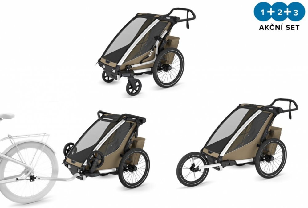 Thule Chariot Cross G3 SINGLE Faded Khaki + bike set + kočárkový set + běžecký set, Sportovní vozíky THULE. Praktický sportovní set vozíku Thule Chariot Cross 2, díky němu můžete vozík používat při jízdě na kole, běhu nebo jako kočárek na procházky.