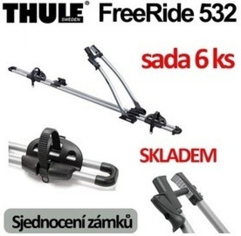 Sada 6 ks Thule 532 se stejnými zámky. Thule FreeRide 532 je vybaven nastavitelnými, rychle uvolnitelnými pásky pro všechny rozměry pneumatik. Důmyslné držáky kol usnadňují nakládání. Thule FreeRide 532 se vyrábí v exklusivní titanové barvě. Nosič Thule FreeRide 532 je včetně t-adaptérů!