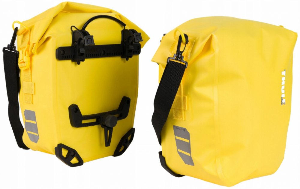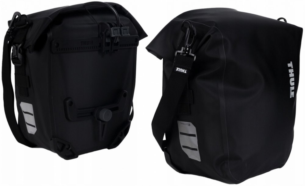 Thule Shield Pannier 13 l, Batohy, tašky a zavazadla. Sada dvou postranních brašen Thule Shield 13L představuje ideální volbu pro všechny cyklisty. Tyto brašny se snadno připevní na jakýkoliv nosič kol o průměru trubek 8–16 mm bez nutnosti použití adaptérů. Po instalaci je jejich nasazení i sejmutí otázkou několika sekund, což oceníte zejména při častém zastavování nebo přenášení výbavy.