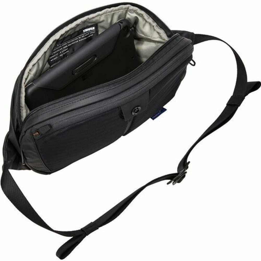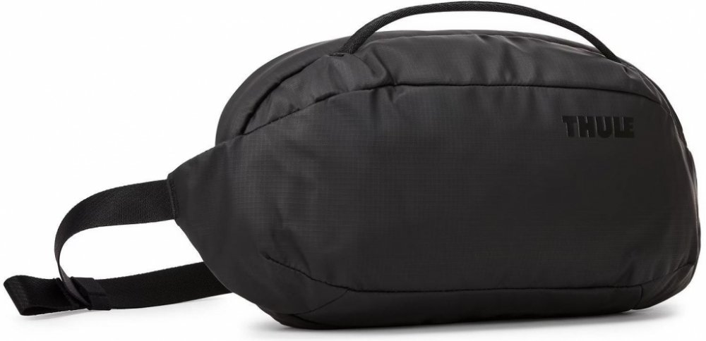 Kompaktní taška - ledvinka značky Thule přes rameno s certifikací bluesign, vyrobená z recyklovaných materiálů, s ochrannými prvky proti krádeži a přihrádkou na drobné předměty.