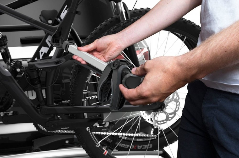 Kola lze uzamknout k cyklistickému nosiči a cyklistický nosič lze uzamknout k tažnému zařízení (zámky jsou součástí balení)