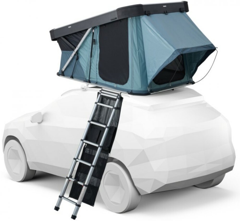 Součástí balení je teleskopický žebřík (délka 2,6 m), který se snadno uchytí a výškově nastaví podle vašeho vozu. Thule myslelo i na čistotu – obal žebříku slouží jako úložný prostor pro boty nebo další vybavení, které tak zůstane v suchu pod stanem. Přední okno lze navíc rozložit jako praktickou markýzu.