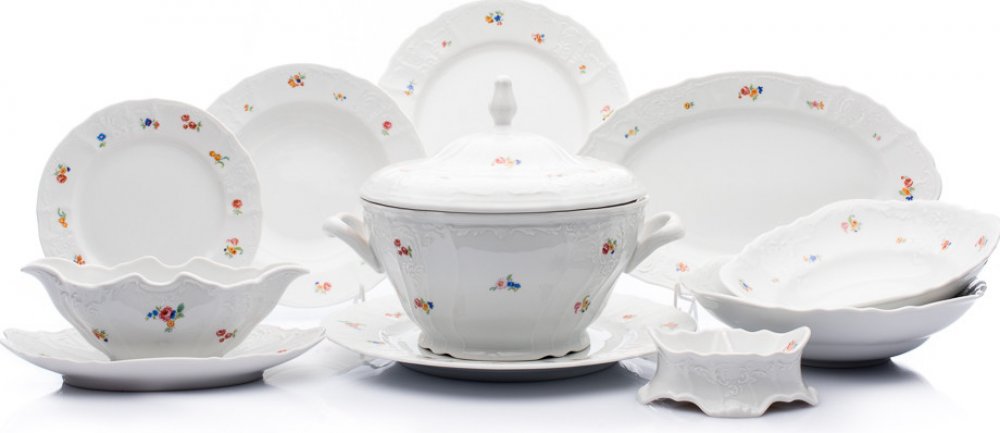 Porcelánová jídelní souprava Bernadotte dekorovaná házenkou. Jídelní souprava obsahuje: 1x mísa polévková s víkem 2,5 l 1x omáčník s podšálkem 1x mísa kompotová 25 cm 1x mísa kompotová 23 cm 1x mísa oválná 34 cm 1x mísa mělká 30 cm 6x talíř mělký 25 cm 6x talíř hluboký 23 cm 6x talíř desertní 19 cm 1x slánka-pepř 2-dílná Český výrobek - vyrábí porcelánka Thun 1794. Porcelán je vhodný do mikrovlnné...