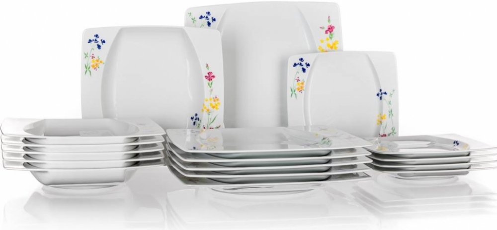 Hlavní přednosti produktu Thun Sada talířová porcelánová EYE 18 dílů Sada talířů Thun skvěle poslouží v domácnosti i v restauracích Do hlubokých talířů můžete servírovat polévky, saláty nebo jiné pokrmy Mělké talíře využijete pro hlavní jídla Bez dezertních talířů se neobejde žádné servírování kulinářských specialit Jsou ideální pro prezentaci různých druhů pokrmů díky svému univerzálnímu provedení. K jejich zhotovení byl použitý kvalitní materiál, jakým je porcelán Porcelánové talíře si tradičně získávají vysokou oblíbenost pro svou odolnost Díky kvalitnímu zpracování je můžete používat do myčky a mikrovlnné trouby Hranatý tvar talířů Thun s rozměry 27 × 27 cm (š×d) si oblíbíte při nevšedním a stylovém stolování Umocňuje je vícebarevné provedení Klasický design se bude na vašem prostřeném stole skvěle vyjímat Pro dekoraci výrobce zvolil květinový motiv Tato jídelní sada talířů je tvořena 18 kusy Balení tvoří dezertní talíř, mělký talíř a hluboký talíř Obsah balení: Dezertní talíř: 6 ks Mělký talíř: 6 ks...
