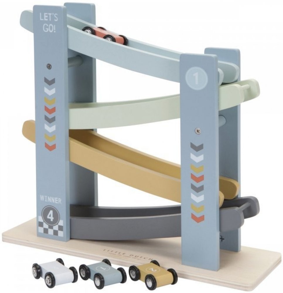 Na značky, připravit, start! Tato dřevěná kaskádová závodní dráha nabízí prostor pro změření rychlosti 4 autíček. Z jednoho patra na druhé, autíčka dělají přemety a jen koukat na ně je zábavné.