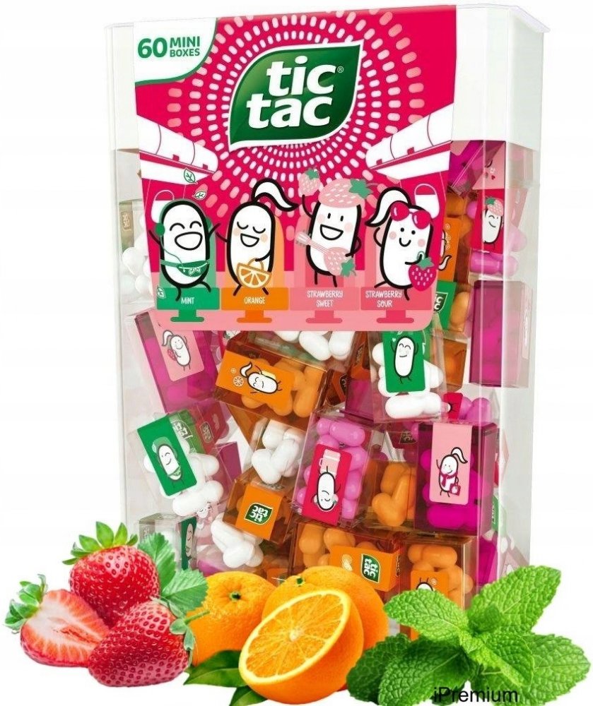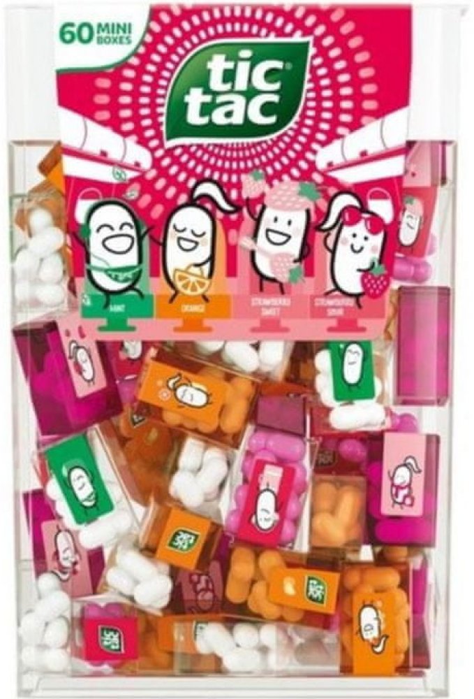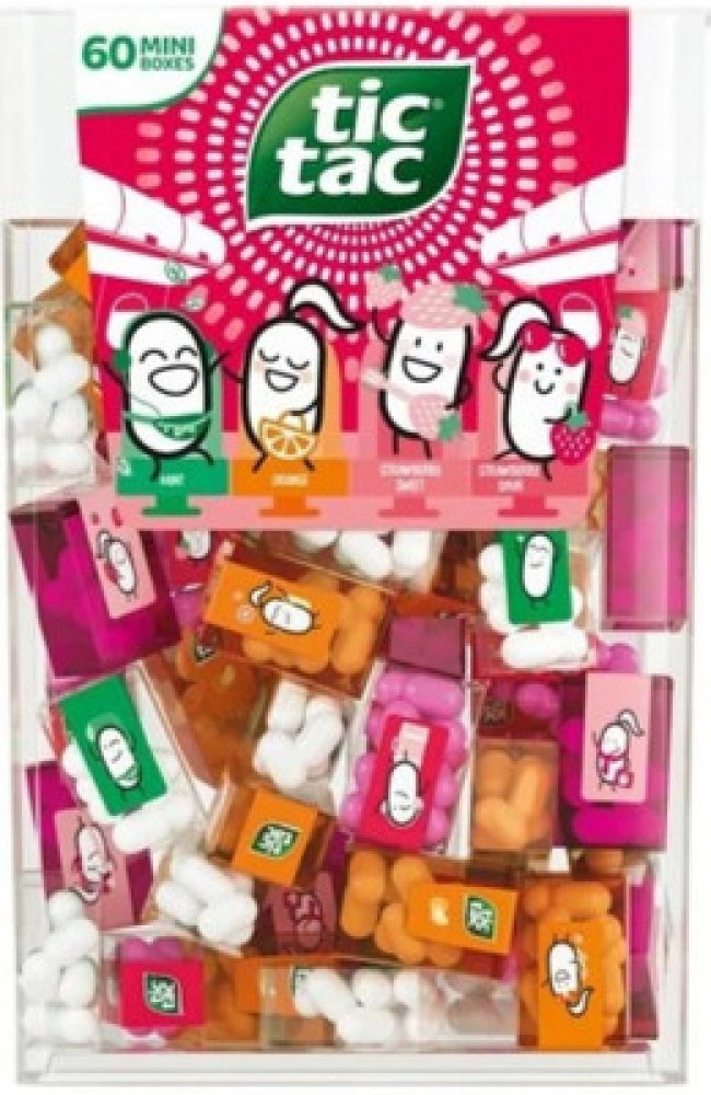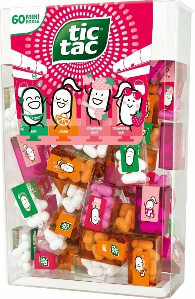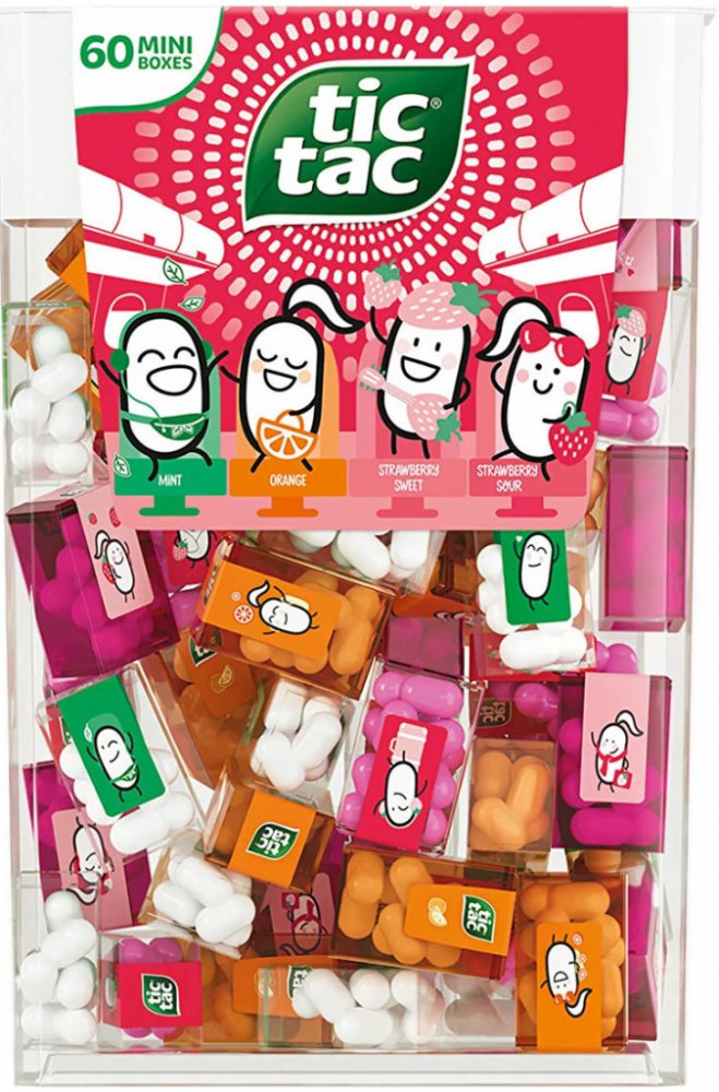 Balení obsahuje 60 mini karbiček s Tic Tac bonbónky - každá krabička (3,9g) obsahuje cca 8 kousků normální velikosti.