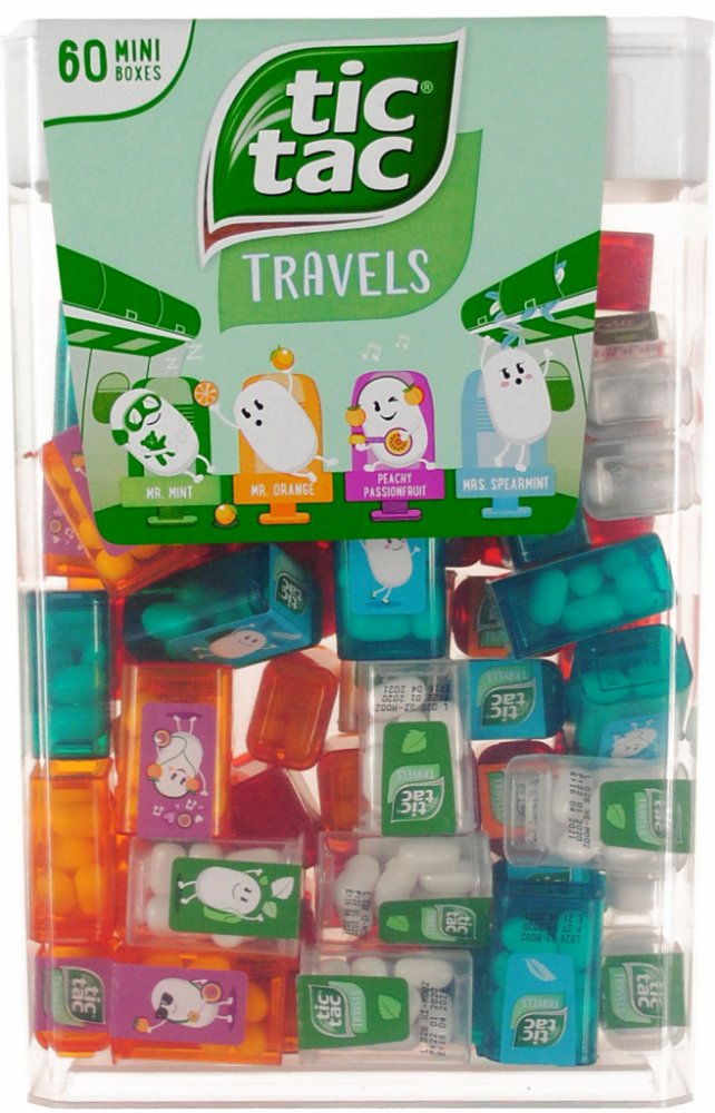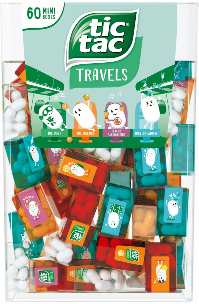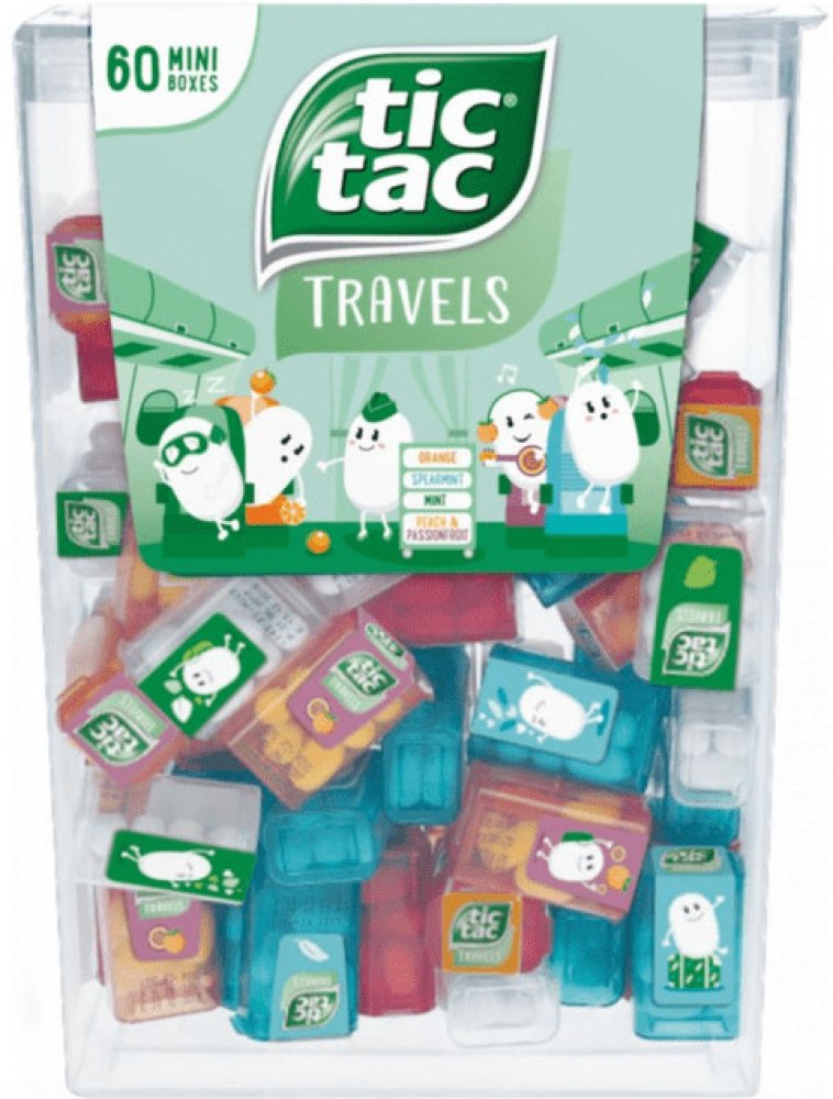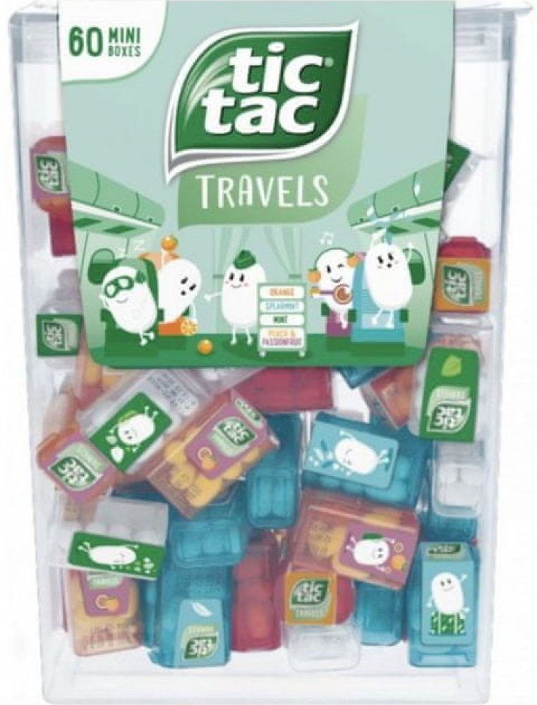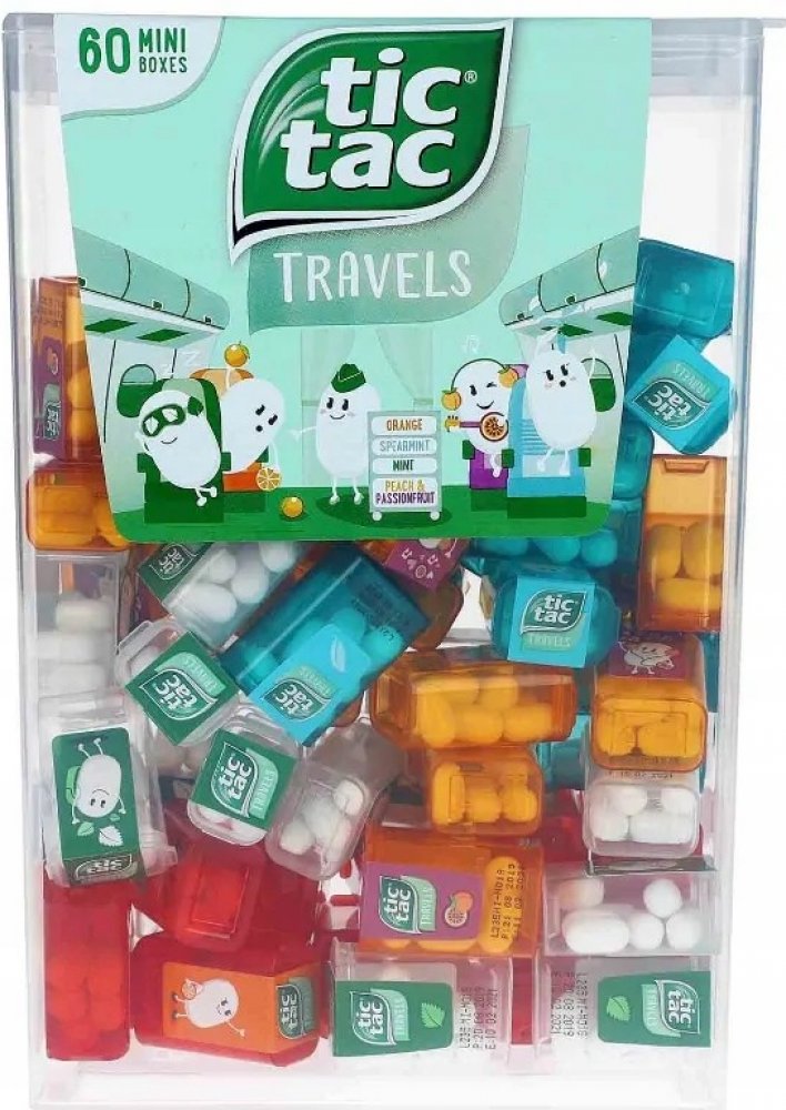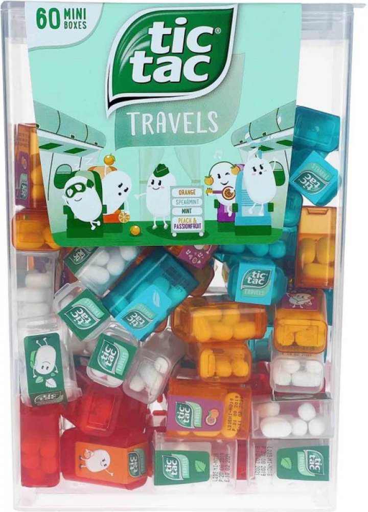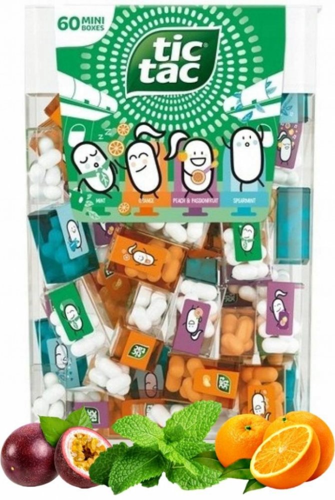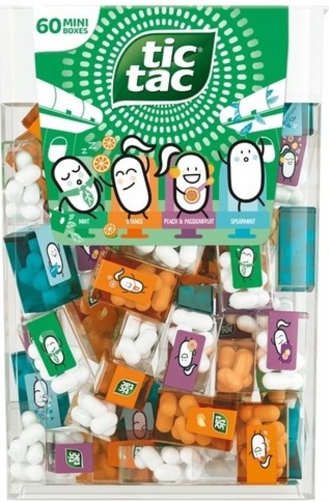 Originální balení oblíbených dropsů Tic Tac. Balení obsahuje 60 mini karbiček s Tic Tac bonbónky - každá taková krabička (3,9g) obsahuje cca 8 dropsů normální velikosti.