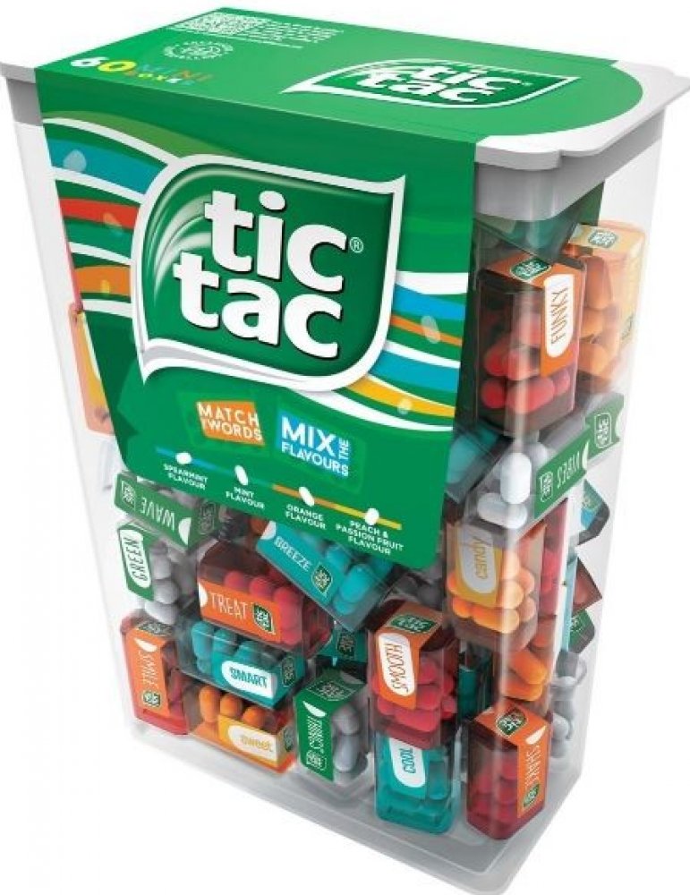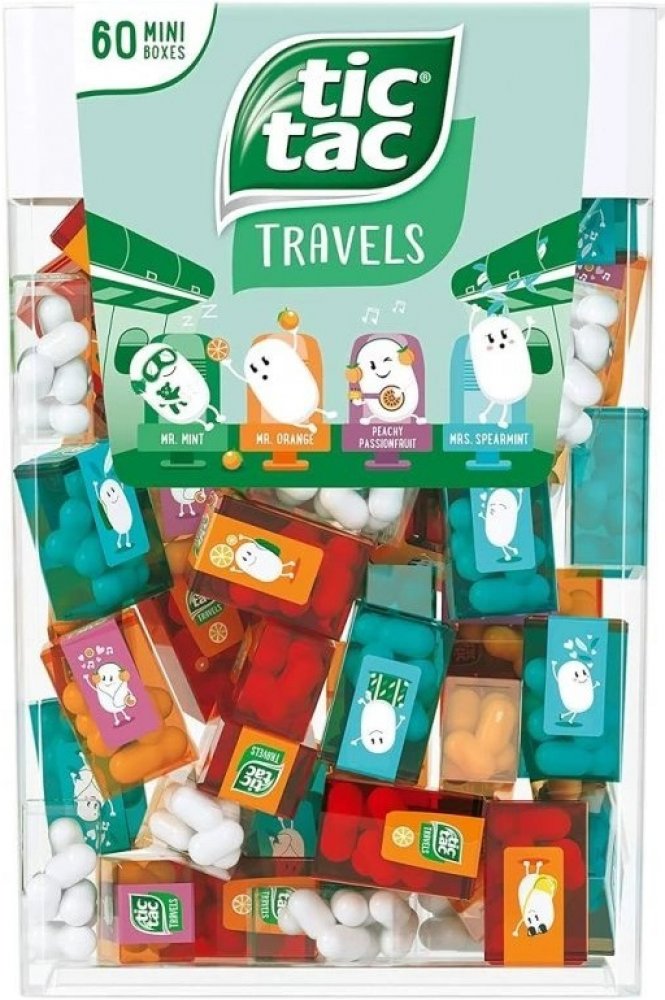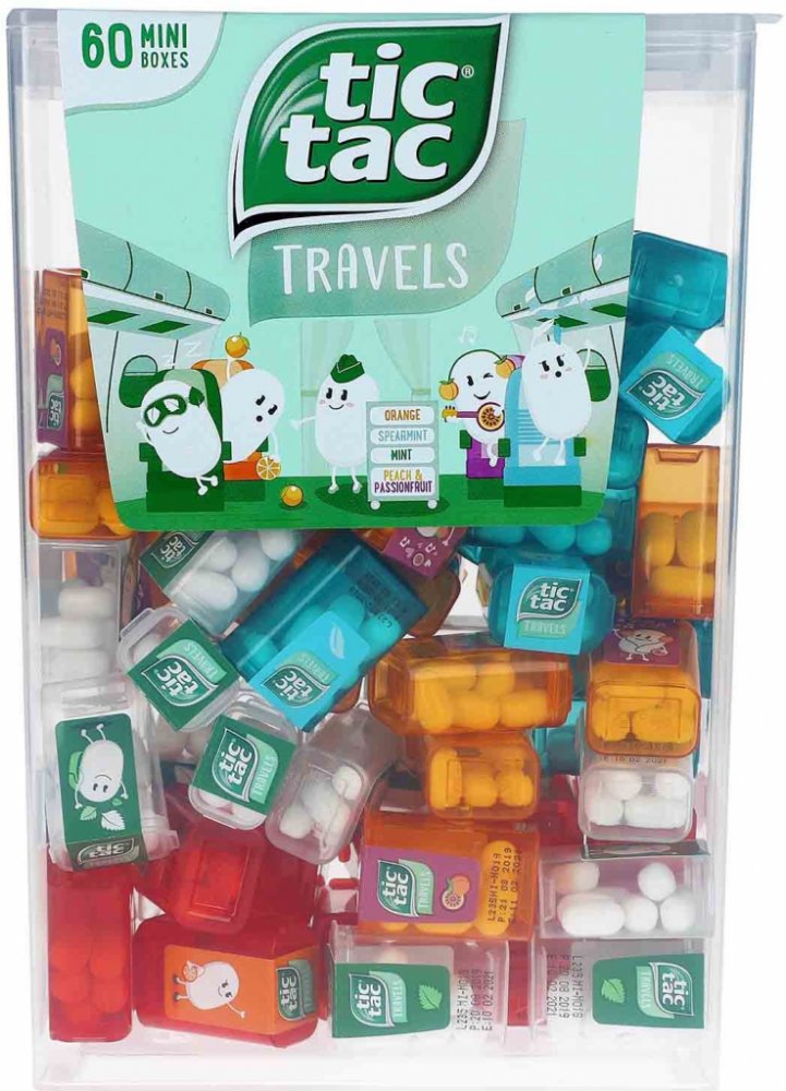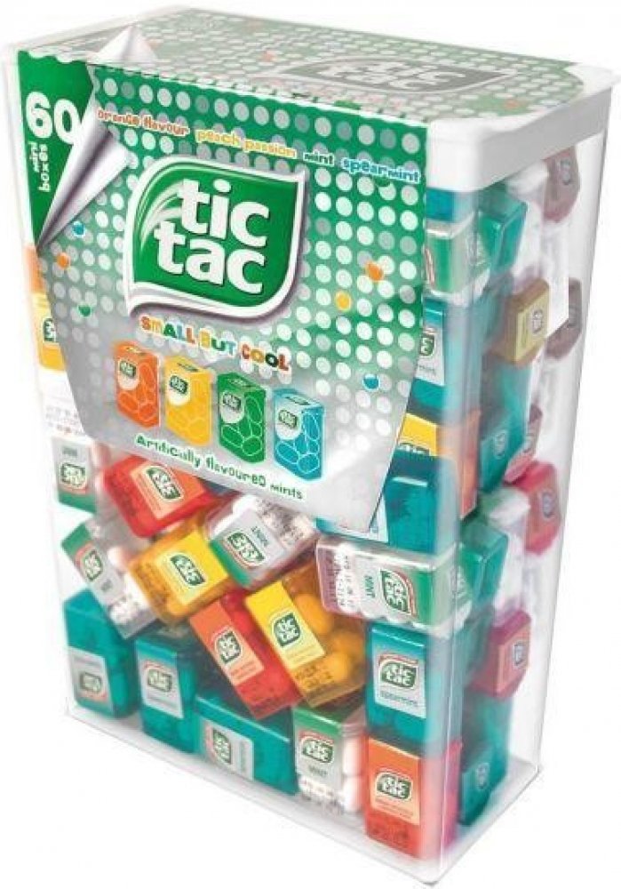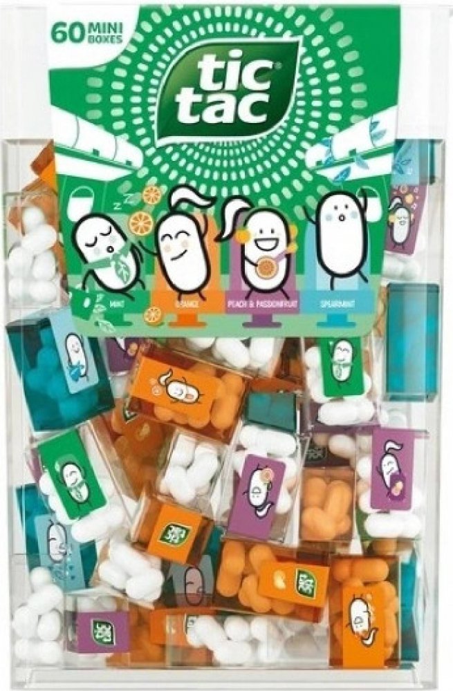 Pořádná krabice tic tac bonbónů obsahuje 60 mini krabiček, v každé z nich je 6-8 bonbónů. Obsahuje čtyři osvěžující příchutě (máta, spearmint, pomeranč a broskev s passion fruit) .