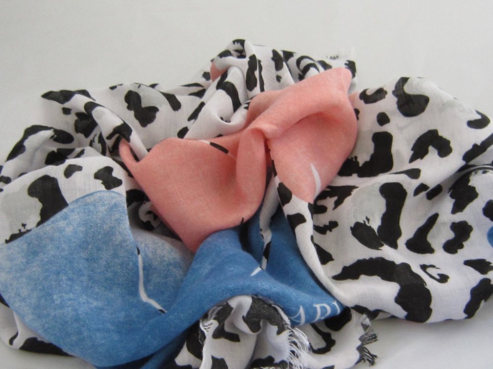 20 % viskóza, 80 % polyester = bezúdržbové, barevně velice praktické zpracování velkého šátku, který se dá nosit na mnoho způsobů. Nápisy se dají schovat nebo zdůraznit podle potřeby. Efektní barevné zpracování, příjemný dotyk na tělo.
