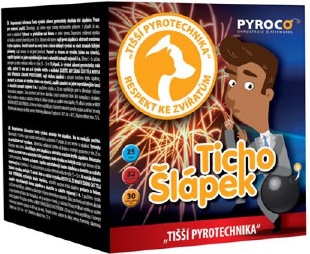 TICHOŠLÁPEK - kompaktní ohňostroj - kompakt 25 ran / 25 mmKód výrobku: 947LEfekt: Multiefektní ohňostroj - tichá multiefektní bateriePočet ran: 25 ran Průměr moždíře: 25 mmDoba trvání efektu: 35 sec.Rozměry (DxŠxV): 15,5x15,5x18 cmHmotnost pyroslože: 302 gTřída nebezpečí: Kategorie F2 - Prodej od 18 let.ADR zařazení: 1,4GVáha: 1,8 kg