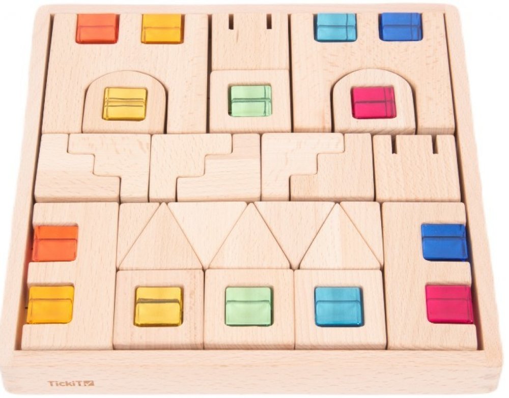 Dřevěné a křišťálově barevné kostky jsou perfektní volbou pro děti, které milují stavění a zároveň sensory play. Tato sada obsahuje kostky různých tvarů a které nabízí nekonečné možnosti pro kreativní hru. Jako bonus je součástí sady i dřevěný podnos s předkreslenou základnou pro každý blok – může sloužit k procvičení tvarů nebo jako puzzle.
