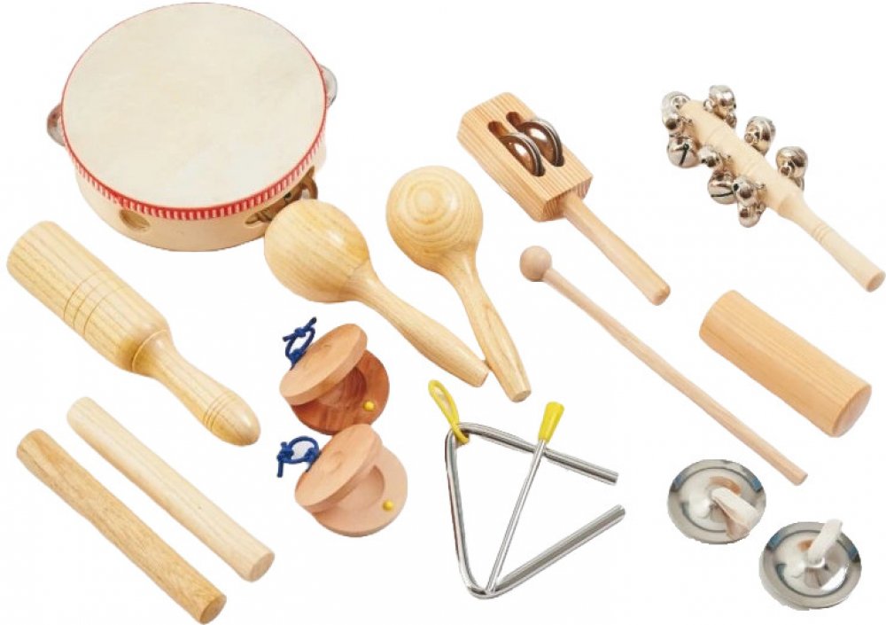 Velikost: guiro 190 mm, prstové činely, Ø 53 mm, rolnička 175 mm včetně rolničky, maracas 150 mm, tamburína Ø 153 mm, šejkrový hrnec 100 mm, kastaněty Ø 53 mm, rytmická klapka 160 mm, klapky 150 mm, triangl. 16 dílná sada v průhledném plastovém obalu.Doporučený věk: vhodné od 3 let.