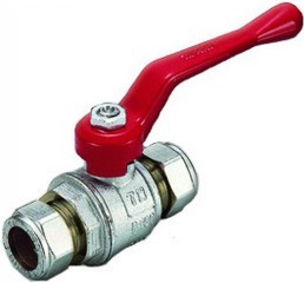 Plnoprůtokové kulové kohouty PN 30 se svěrnými koncovkami pro montáž na měděné trubky, s červeným hliníkovým plochým nebo motýlkovým uzávěrem. T = -20°- 120°C