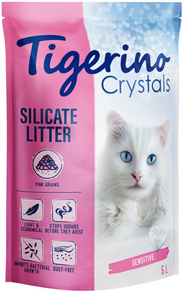 Kočkolit Tigerino Crystals Fun pohltí díky silikátu nepříjemné pachy během několika sekund! Toto stelivo poskytne Vaší kočičce ten nejvyšší komfort a díky jemným zrníčkům je velmi šetrné ke kočičím tlapkám. Tigerino Crystals Fun je k dostupné ve dvou barevných provedeních: v modré a růžové. Z kočičí toalety se tak rázem stane stylový doplněk Vašeho interiéru. Díky jemné písčité konzistenci si Váš mazlíček tuto podestýlku zamiluje. Tigerino Crystals Fun pojme téměř stejné množství kapaliny, jako je jeho hmotnost. Nesčetné mikropóry ihned absorbují vlhkost a udržují tak toaletu neustále čistou. Během několika sekund dojde k pohlcení moči, výkalů a pachů; pachové molekuly jsou absorbovány a vlhkost se vypaří. Vlastnosti kočkolitu Tigerino Crystals Fun v krátkém přehledu: obarveno potravinářskými barvami - modrou nebo růžovou: jedinečný design, který oživí kočičí toaletu velmi jemná zrníčka: šetrné k tlapkám pohltí pachy ještě předtím, než vzniknou lehké a trvanlivé nelepí se na tlapky Umístěte toaletu do teplé, suché místnosti. Můžete použít i předložku k toaletě. Zbarvení zrníček nemá vliv na schopnost absorbovat vlhkost a pachy. Nesčetné mikropóry steliva Tigerino ihned pohlcují vlhkost a udržují tak toaletu neustále suchou. Pokud si Vaše kočka na nové stelivo ihned nezvykne, což se stává velmi zřídka, smíchejte první balení kočkolitu Tigerino s dosavadním stelivem (což může ovlivnit účinky). Kočkolit Tigerino Crystals Fun je obarvený potravinářskými barvami, je tedy pro Vaši kočku neškodný! Trvanlivost 5 l balení steliva Tigerino: 1 kočka cca 25–30 dní 2 kočky cca 15–20 dní 3 kočky cca 8–12 dní Použití: Naplňte čistou toaletu cca 4 cm vysokou vrstvou silikátového kočkolitu Tigerino Crystals Fun. Denně odstraňujte výkaly a pravidelně stelivo promíchejte – pro optimální účinky, trvanlivost a čerstvost. Silikátový kočkolit šetrný k životnímu prostředí zlikvidujte do bioodpadu nebo kompostu.