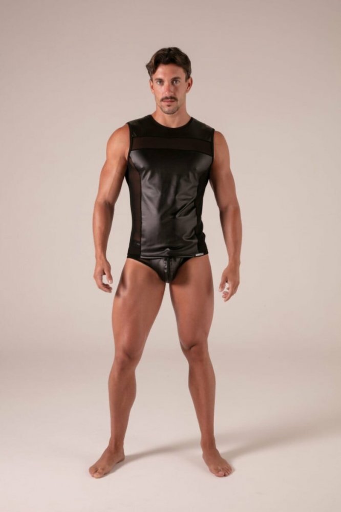 Pánské fetiš tílko kombinuje koženku a prodyšnou síťovinu. Přiléhavý střih zvýrazňuje ramena, hrudník i pas. Na spodní straně diskrétní silikonové logo Absolu Male a integrovaná tajná kapsa. Výrazný model do klubu i do ložnice. Vyrobeno ve Francii.